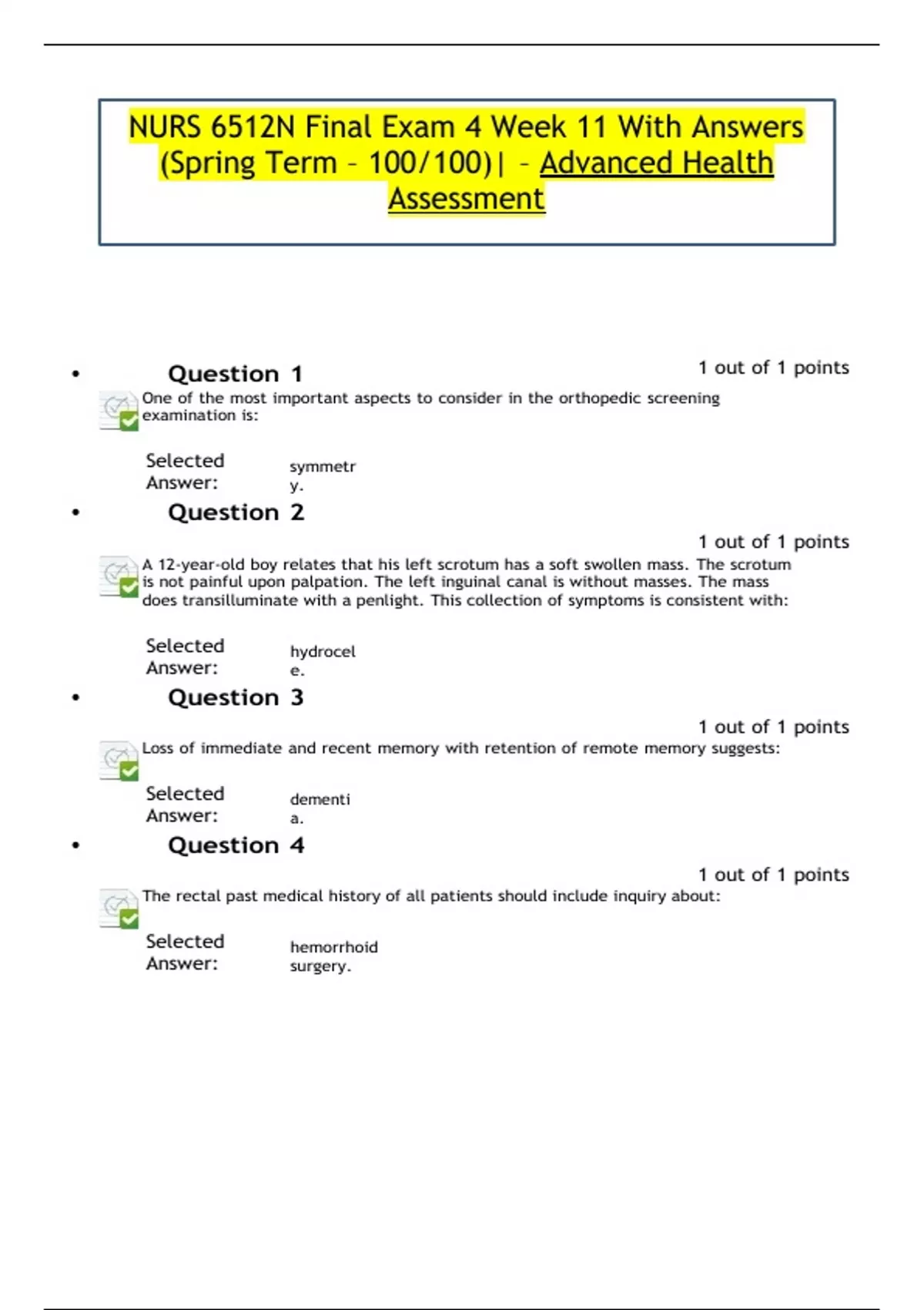NURS 6512N Final Exam 4 Week 11 With Answers (Spring Term – 100/100)| – Advanced Health Assessment NURS 6512N-49 Final Exam Week 11 – Advanced Health Assessment 100 out of 100 points One of the most important aspects to consider in the orthopedic screening examination is: A 12-year-old boy relates that his left scrotum has a soft swollen mass. The scrotum is not painful upon palpation. The left inguinal canal is without masses. The mass does transilluminate with a penlight. This collection of symptoms is consistent with: Loss of immediate and recent memory with retention of remote memory suggests: The rectal past medical history of all patients should include inquiry about: A common finding in markedly obese and pregnant women is: Kawasaki disease is suspected when assessments of a child reveal: The musculoskeletal examination should begin when: At your first meeting with a patient, it is usually best to say: A pulsation that is diminished to the point of being barely palpable would be graded as: While examining a 30-year-old woman, you note that one breast is slightly larger than the other. In response to this finding, you should: Nancy Walker is a 16-year-old girl who presents to the clinic with complaints of severe, acute chest pain. Her mother reports that Nancy, apart from occasional colds, Nancy is not prone to respiratory problems. What potential risk factor is most important to assess with regards to Nancy’s current problem? Which of the following statements is true regarding the examination of peripheral arteries? Which one of the following techniques is used to detect a torn meniscus? The finger-to-nose test allows assessment of: You are performing a two-point discrimination test as part of a well physical examination. The area with the ability to discern two points in the shortest distance is the: Postural hypotension is defined as a _____ when the patient stands, compared with sitting or supine readings. A 23-year-old white woman has come to the clinic because she has missed two menstrual periods. She states that her breasts have enlarged and that her nipples have turned a darker color. Your further response to this finding is to: Montgomery tubercles are most prominent in the breasts of: When palpating joints, crepitus may occur when: The Mini-Mental State Examination should be administered for the patient who: Breath sounds normally heard over the trachea are called: When assessing superficial pain, touch, vibration, and position perceptions, you are testing: In the most effective percussion technique of the posterior lung fields, the patient cooperates by: Diabetic peripheral neuropathy will likely produce: Which cranial nerves are usually evaluated during the examination of the eyes? To assess spinal levels L2, L3, and L4, which deep tendon reflex should be tested? Nerves that arise from the brain rather than the spinal cord are called: The best way to ease the apprehension of a 3-year-old child before a physical examination is to: Which condition is considered progressive rather than reversible? You are conducting an examination of Mr. Curtis’s heart and blood vessels and auscultate a grade III murmur. The intensity of this murmur is: Inspection of the scrotum should reveal: (NURS 6512N final exam) You are conducting a preparticipation physical examination for a 10-year-old girl with Down syndrome who will be playing basketball. She has slight torticollis and mild ankle clonus. What additional diagnostic testing would be required for her? If pitting edema is unilateral, you would suspect occlusion of a: The physical assessment technique most frequently used to assess joint symmetry is: The foramen ovale should close: When assessing a 17-year-old for nuchal rigidity, you gently raise his head off the examination table. He involuntarily flexes his hips and knees. To confirm your suspicions associated with this positive test, you would also perform a test for the _____ sign. Ulnar deviation and boutonniere deformities are characteristic of: A grade IV mitral regurgitation murmur would: Anterior cruciate ligament integrity is assessed via the _____ test. Bimanual examination of the uterus includes: A red, hot swollen joint in a 40-year-old man should lead you to suspect: A parent is advised to restrict contact or collision sports participation for their child. An example of a sport in which this child could participate is: Normal changes of the aging brain include: The reliability of health-related findings and observations is the responsibility of the: Temporalis and masseter muscles are evaluated by: The Denver II is a tool used to determine: When conducting a geriatric assessment, basic activities of daily living (ADLs) include: A positive straight leg raise test usually indicates: You are interviewing a 20-year-old patient with a new-onset psychotic disorder. The patient is apathetic and has disturbed thoughts and language patterns. The nurse recognizes this behavior pattern as consistent with a diagnosis of: An idiopathic spasm of arterioles in the digits is termed: Assessing orientation to person, place, and time helps determine: An ophthalmoscopic eye examination involves: An examiner has rotated a brush several times into the cervical os. The brush was withdrawn and stroked lightly on a glass slide. The slide was sprayed with fixative. Which type of specimen requires this technique for collection? Your 15-year-old patient is athletic and thin. Radiography of an ankle injury reveals a stress fracture. You should question this patient about her: The goals of preparticipation sports evaluation include: Inquiry about nocturnal muscle spasms would be most significant when taking the musculoskeletal history of: Palpation of a normal prostate in an older adult is likely to feel: As Mr. B. enters the room, you observe that his gait is wide based and he staggers from side to side while swaying his trunk. You would document Mr. B.’s pattern as: For purposes of exam