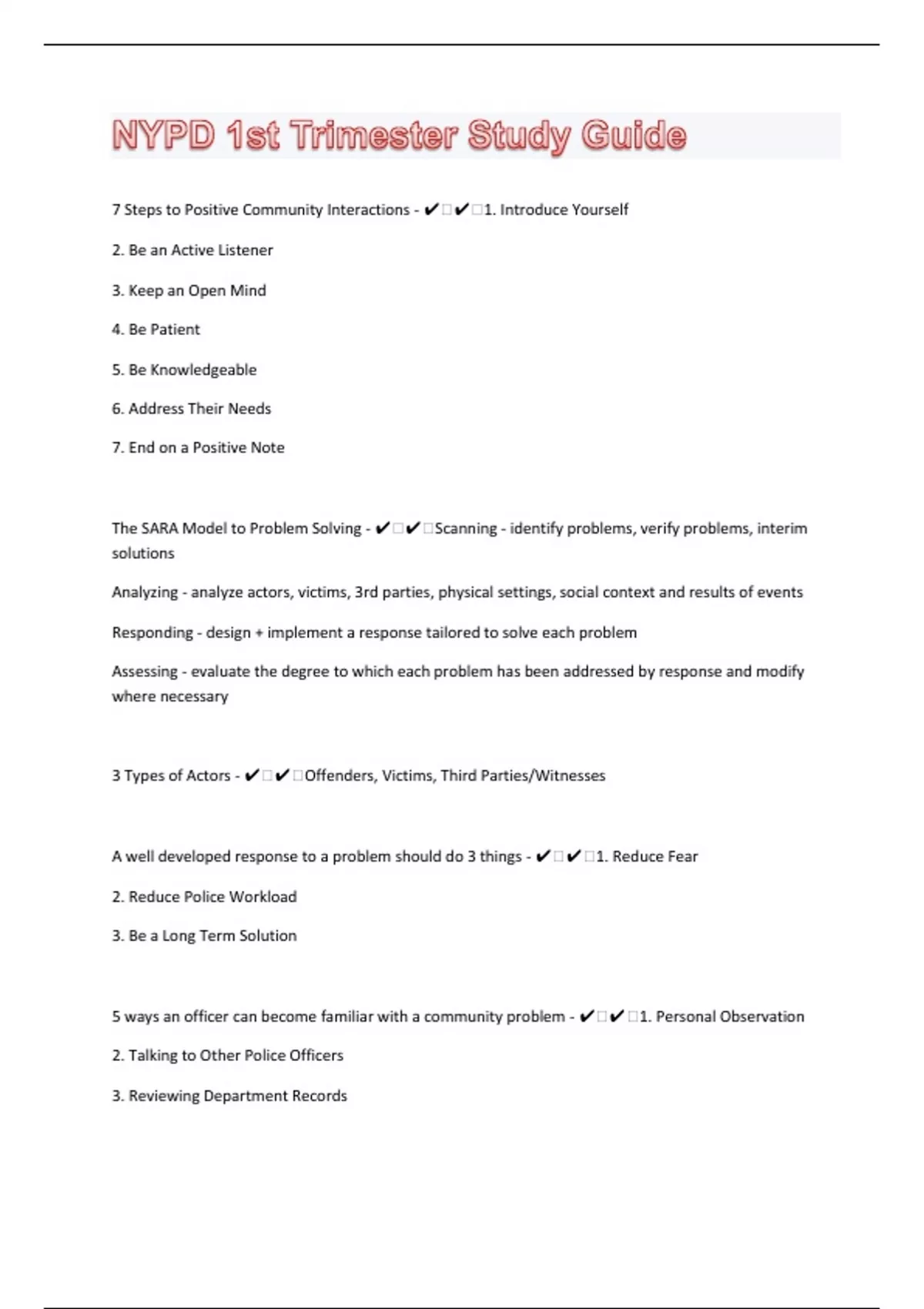7 Steps to Positive Community Interactions - ️️1. Introduce Yourself 2. Be an Active Listener 3. Keep an Open Mind 4. Be Patient 5. Be Knowledgeable 6. Address Their Needs 7. End on a Positive Note The SARA Model to Problem Solving - ️️Scanning - identify problems, verify problems, interim solutions Analyzing - analyze actors, victims, 3rd parties, physical settings, social context and results of events Responding - design + implement a response tailored to solve each problem Assessing - evaluate the degree to which each problem has been addressed by response and modify where necessary 3 Types of Actors - ️️Offenders, Victims, Third Parties/Witnesses A well developed response to a problem should do 3 things - ️️1. Reduce Fear 2. Reduce Police Workload 3. Be a Long Term Solution 5 ways an officer can become familiar with a community problem - ️️1. Personal Observation 2. Talking to Other Police Officers 3. Reviewing Department Records
