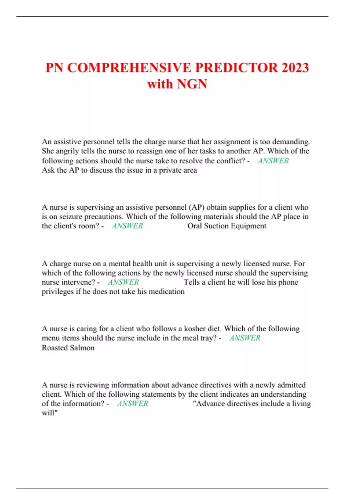 PN COMPREHENSIVE PREDICTOR 2023 with NGN An assistive personnel tells the charge nurse that her assignment is too demanding. She angrily tells the nurse to reassign one of her tasks to another AP. Which of the following actions should the nurse take to resolve the conflict? - ANSWER Ask the AP to discuss the issue in a private area A nurse is supervising an assistive personnel (AP) obtain supplies for a client who is on seizure precautions. Which of the following materials should the AP place in the client's room? - ANSWER Oral Suction Equipment A charge nurse on a mental health unit is supervising a newly licensed nurse. For which of the following actions by the newly licensed nurse should the supervising nurse intervene? - ANSWER Tells a client he will lose his phone privileges if he does not take his medication A nurse is caring for a client who follows a kosher diet. Which of the following menu items should the nurse include in the meal tray? - ANSWER Roasted Salmon A nurse is reviewing information about advance directives with a newly admitted client. Which of the following statements by the client indicates an understanding of the information? - ANSWER "Advance directives include a living will"