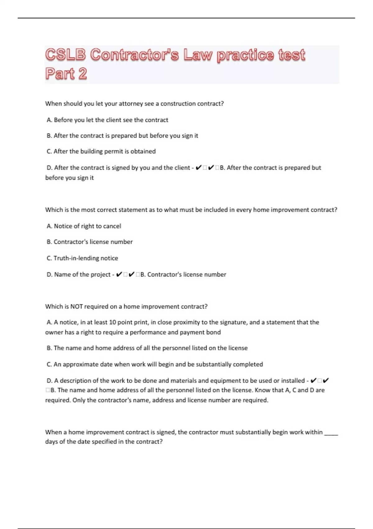 When should you let your attorney see a construction contract? A. Before you let the client see the contract B. After the contract is prepared but before you sign it C. After the building permit is obtained D. After the contract is signed by you and the client - ️️B. After the contract is prepared but before you sign it Which is the most correct statement as to what must be included in every home improvement contract? A. Notice of right to cancel B. Contractor's license number C. Truth-in-lending notice D. Name of the project - ️️B. Contractor's license number Which is NOT required on a home improvement contract? A. A notice, in at least 10 point print, in close proximity to the signature, and a statement that the owner has a right to require a performance and payment bond B. The name and home address of all the personnel listed on the license C. An approximate date when work will begin and be substantially completed D. A description of the work to be done and materials and equipment to be used or installed - ️️B. The name and home address of all the personnel listed on the license. Know that A, C and D are required. Only the contractor's name, address and license number are required.
