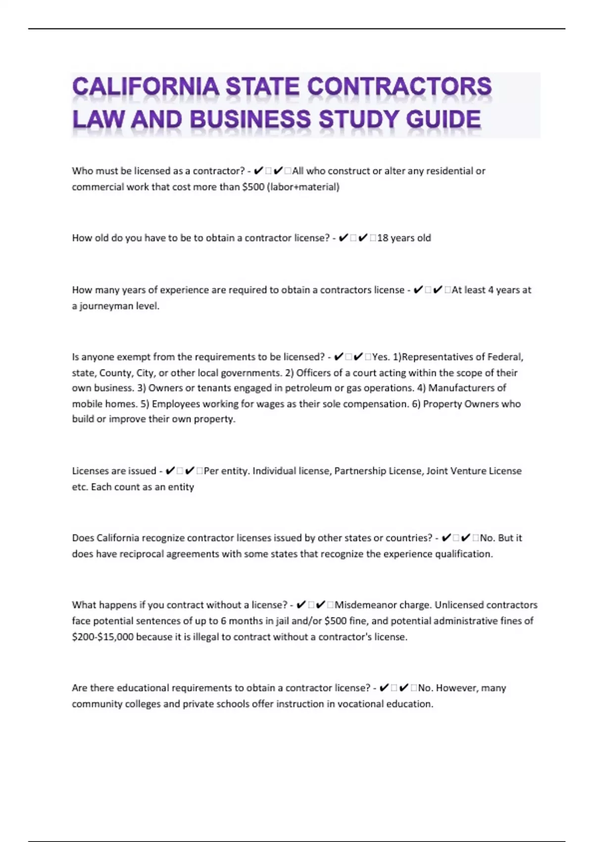 California State Contractors Law and Business Study Guide 102 Questions with 100% Correct Answers | Updated 2024 | Guaranteed A+