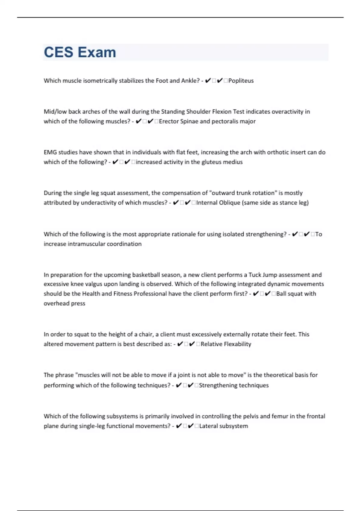 Which muscle isometrically stabilizes the Foot and Ankle? - ️️Popliteus Mid/low back arches of the wall during the Standing Shoulder Flexion Test indicates overactivity in which of the following muscles? - ️️Erector Spinae and pectoralis major EMG studies have shown that in individuals with flat feet, increasing the arch with orthotic insert can do which of the following? - ️️increased activity in the gluteus medius During the single leg squat assessment, the compensation of "outward trunk rotation" is mostly attributed by underactivity of which muscles? - ️️Internal Oblique (same side as stance leg) Which of the following is the most appropriate rationale for using isolated strengthening? - ️️To increase intramuscular coordination In preparation for the upcoming basketball season, a new client performs a Tuck Jump assessment and excessive knee valgus upon landing is observed. Which of the following integrated dynamic movements should be the Health and Fitness Professional have the client perform first? - ️️Ball squat with overhead press In order to squat to the height of a chair, a client must excessively externally rotate their feet. This altered movement pattern is best described as: - ️️Relative Flexability The phrase "muscles will not be able to move if a joint is not able to move" is the theoretical basis for performing which of the following techniques? - ️️Strengthening techniques Which of the following subsystems is primarily involved in controlling the pelvis and femur in the frontal plane during single-leg functional movements? - ️️Lateral subsystem