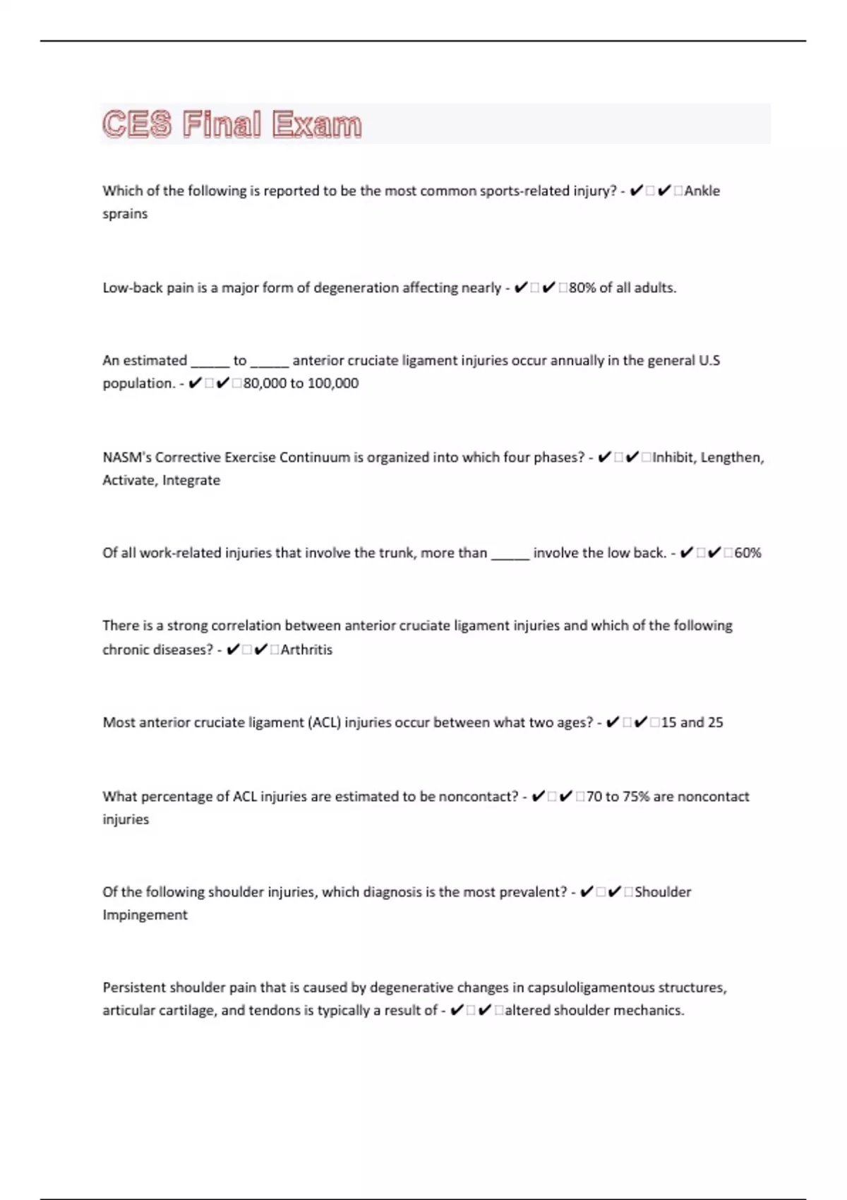 Which of the following is reported to be the most common sports-related injury? - ️️Ankle sprains Low-back pain is a major form of degeneration affecting nearly - ️️80% of all adults. An estimated _____ to _____ anterior cruciate ligament injuries occur annually in the general U.S population. - ️️80,000 to 100,000 NASM's Corrective Exercise Continuum is organized into which four phases? - ️️Inhibit, Lengthen, Activate, Integrate Of all work-related injuries that involve the trunk, more than _____ involve the low back. - ️️60% There is a strong correlation between anterior cruciate ligament injuries and which of the following chronic diseases? - ️️Arthritis Most anterior cruciate ligament (ACL) injuries occur between what two ages? - ️️15 and 25 What percentage of ACL injuries are estimated to be noncontact? - ️️70 to 75% are noncontact injuries Of the following shoulder injuries, which diagnosis is the most prevalent? - ️️Shoulder Impingement Persistent shoulder pain that is caused by degenerative changes in capsuloligamentous structures, articular cartilage, and tendons is typically a result of - ️️altered shoulder mechanics.
