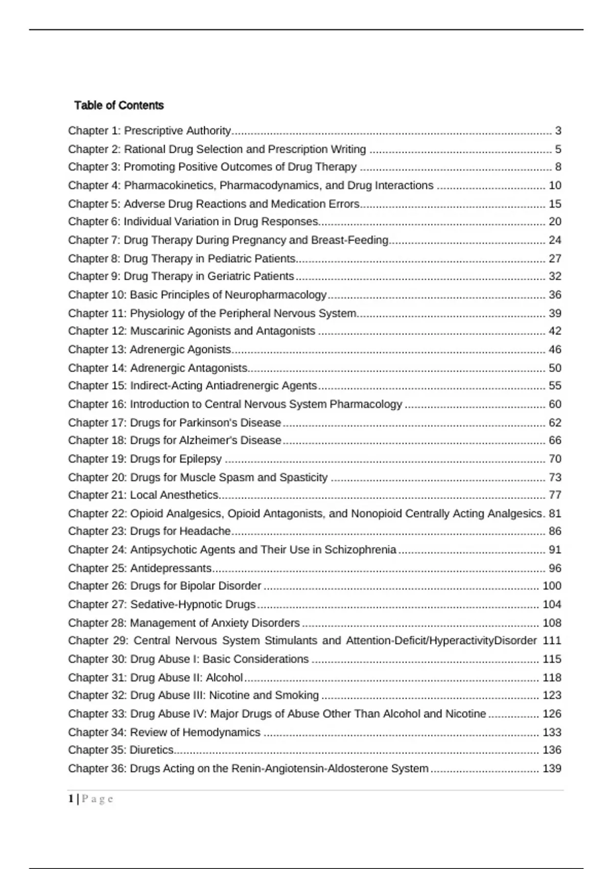 TEST BANK ROSENTHAL LEHNE'S PHARMACOTHERAPEUTICS FOR ADVANCED PRACTICE PROVIDERS 1ST EDITIONTable of Contents Chapter 1: Prescriptive Authority .................................................................................................... 3 Chapter 2: Rational Drug Selection and Prescription Writing ......................................................... 5 Chapter 3: Promoting Positive Outcomes of Drug Therapy ............................................................ 8 Chapter 4: Pharmacokinetics, Pharmacodynamics, and Drug Interactions .................................. 10 Chapter 5: Adverse Drug Reactions and Medication Errors .......................................................... 15 Chapter 6: Individual Variation in Drug Responses....................................................................... 20 Chapter 7: Drug Therapy During Pregnancy and Breast-Feeding ................................................. 24 Chapter 8: Drug Therapy in Pediatric Patients .............................................................................. 27 Chapter 9: Drug Therapy in Geriatric Patients .............................................................................. 32 Chapter 10: Basic Principles of Neuropharmacology .................................................................... 36 Chapter 11: Physiology of the Peripheral Nervous System ........................................................... 39 Chapter 12: Muscarinic Agonists and Antagonists ....................................................................... 42 Chapter 13: Adrenergic Agonists .................................................................................................. 46 Chapter 14: Adrenergic Antagonists............................................................................................. 50 Chapter 15: Indirect-Acting Antiadrenergic Agents ....................................................................... 55 Chapter 16: Introduction to Central Nervous System Pharmacology ............................................ 60 Chapter 17: Drugs for Parkinson's Disease .................................................................................. 62 Chapter 18: Drugs for Alzheimer's Disease .................................................................................. 66 Chapter 19: Drugs for Epilepsy .................................................................................................... 70 Chapter 20: Drugs for Muscle Spasm and Spasticity ................................................................... 73 Chapter 21: Local Anesthetics ...................................................................................................... 77 Chapter 22: Opioid Analgesics, Opioid Antagonists, and Nonopioid Centrally Acting Analgesics . 81 Chapter 23: Drugs for Headache .................................................................................................. 86 Chapter 24: Antipsychotic Agents and Their Use in Schizophrenia .............................................. 91 Chapter 25: Antidepressants ........................................................................................................ 96 Chapter 26: Drugs for Bipolar Disorder ...................................................................................... 100 Chapter 27: Sedative-Hypnotic Drugs ........................................................................................ 104 Chapter 28: Management of Anxiety Disorders .......................................................................... 108 Chapter 29: Central Nervous System Stimulants and Attention-Deficit/Hyperactivity Disorder 111 Chapter 30: Drug Abuse I: Basic Considerations ....................................................................... 115 Chapter 31: Drug Abuse II: Alcohol ............................................................................................ 118 Chapter 32: Drug Abuse III: Nicotine and Smoking .................................................................... 123 Chapter 33: Drug Abuse IV: Major Drugs of Abuse Other Than Alcohol and Nicotine ................ 126 Chapter 34: Review of Hemodynamics ...................................................................................... 133 Chapter 35: Diuretics.................................................................................................................. 136 Chapter 36: Drugs Acting on the Renin-Angiotensin-Aldosterone System .................................. 139 1 | P a g eChapter 37: Calcium Channel Blockers ...................................................................................... 144 Chapter 38: Vasodilators ............................................................................................................ 146 Chapter 39: Drugs for Hypertension ........................................................................................... 150 Chapter 40: Drugs for Heart Failure ........................................................................................... 157 Chapter 41: Antidysrhythmic Drugs ............................................................................................ 164 Chapter 42: Prophylaxis of Atherosclerotic Cardiovascular Disease: Drugs That Help Normalize Cholesterol and Triglyceride Levels ........................................................................................... 171 Chapter 43: Drugs for Angina Pectoris ....................................................................................... 177 Chapter 44: Anticoagulant, Antiplatelet, and Thrombolytic Drugs ............................................... 183 Chapter 45: Drugs for Deficiency Anemias ................................................................................. 189 Chapter 46: Drugs for Diabetes Mellitus ..................................................................................... 195 Chapter 47: Drugs for Thyroid Disorders ..................................