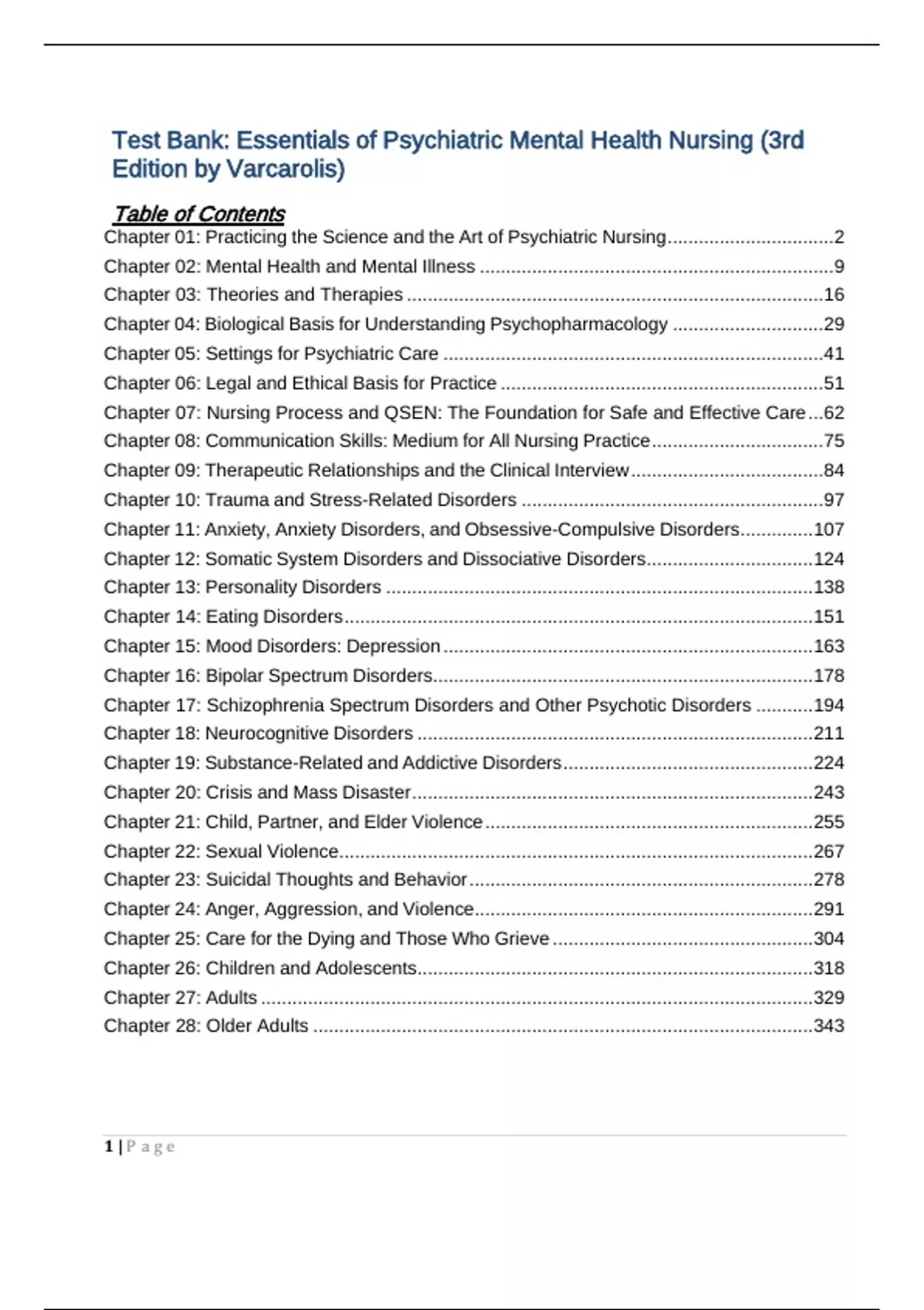 TEST BANK VARCAROLIS ESSENTIALS OF PSYCHIATRIC MENTAL HEALTH NURSING 3RD EDITIONTable of Contents Chapter 01: Practicing the Science and the Art of Psychiatric Nursing ................................ 2 Chapter 02: Mental Health and Mental Illness .................................................................... 9 Chapter 03: Theories and Therapies ................................................................................ 16 Chapter 04: Biological Basis for Understanding Psychopharmacology ............................. 29 Chapter 05: Settings for Psychiatric Care ......................................................................... 41 Chapter 06: Legal and Ethical Basis for Practice .............................................................. 51 Chapter 07: Nursing Process and QSEN: The Foundation for Safe and Effective Care ... 62 Chapter 08: Communication Skills: Medium for All Nursing Practice ................................. 75 Chapter 09: Therapeutic Relationships and the Clinical Interview ..................................... 84 Chapter 10: Trauma and Stress-Related Disorders .......................................................... 97 Chapter 11: Anxiety, Anxiety Disorders, and Obsessive-Compulsive Disorders .............. 107 Chapter 12: Somatic System Disorders and Dissociative Disorders ................................ 124 Chapter 13: Personality Disorders .................................................................................. 138 Chapter 14: Eating Disorders .......................................................................................... 151 Chapter 15: Mood Disorders: Depression ....................................................................... 163 Chapter 16: Bipolar Spectrum Disorders ......................................................................... 178 Chapter 17: Schizophrenia Spectrum Disorders and Other Psychotic Disorders ........... 194 Chapter 18: Neurocognitive Disorders ............................................................................ 211 Chapter 19: Substance-Related and Addictive Disorders ................................................ 224 Chapter 20: Crisis and Mass Disaster ............................................................................. 243 Chapter 21: Child, Partner, and Elder Violence ............................................................... 255 Chapter 22: Sexual Violence ........................................................................................... 267 Chapter 23: Suicidal Thoughts and Behavior .................................................................. 278 Chapter 24: Anger, Aggression, and Violence ................................................................. 291 Chapter 25: Care for the Dying and Those Who Grieve .................................................. 304 Chapter 26: Children and Adolescents ............................................................................ 318 Chapter 27: Adults .......................................................................................................... 329 Chapter 28: Older Adults ................................................................................................ 343 1 | P a g eChapter 01: Practicing the Science and the Art of Psychiatric Nursing MULTIPLE CHOICE 1. Which outcome, focused on recovery, would be expected in the plan of care for a patient living in the community and diagnosed with serious and persistent mental illness? Within 3 months, the patient will: a. deny suicidal ideation. b. report a sense of well-being. c. take medications as prescribed. d. attend clinic appointments on time. ANS: B Recovery emphasizes managing symptoms, reducing psychosocial disability, and improving role performance. The goal of recovery is to empower the individual with mental illness to achieve a sense of meaning and satisfaction in life and to function at the highest possible level of wellness. The incorrect options focus on the classic medical model rather than recovery. DIF: Cognitive Level: Application (Applying) REF: 2 TOP: Nursing Process: Outcomes Identification MSC: NCLEX: Health Promotion and Maintenance 2. In the shift-change report, an off-going nurse criticizes a patient who wears heavy makeup. Which comment by the nurse who receives the report best demonstrates advocacy? a. This is a psychiatric hospital. Craziness is what we are all about. b. Lets all show acceptance of this patient by wearing lots of makeup too. c. Your comments are inconsiderate and inappropriate. Keep the report objective. d. Our patients need our help to learn behaviors that will help them get along in society. ANS: D Accepting patients needs for self-expression and seeking to teach skills that will contribute to their well-being demonstrate respect and are important parts of advocacy. The on- coming nurse needs to take action to ensure that others are not prejudiced against the patient. Humor can be appropriate within the privacy of a shift report but not at the expense of respect for patients. Judging the off-going nurse in a critical way will create conflict. Nurses must show compassion for each other. 2 | P a g eDIF: Cognitive Level: Application (Applying) REF: 8 TOP: Nursing Process: Implementation MSC: NCLEX: Safe, Effective Care Environment 3. A nurse assesses a newly admitted patient diagnosed with major depressive disorder. Which statement is an example of attending? a. We all have stress in life. Being in a psychiatric hospital isnt the end of the world. b. Tell me why you felt you had to be hospitalized to receive treatment for your depression. c. You will feel better after we get some antidepressant medication started for you. d. Id like to sit with you a while so you may feel more comfortable talking with me. ANS: D Attending is a technique that demonstrates the nurses commitment to the relationship and reduces feelings of isolation. This technique shows respect for the patient and demonstra