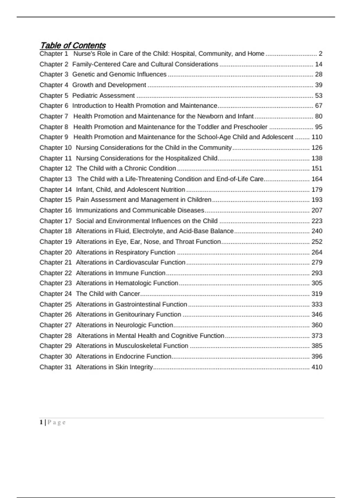 TEST BANK PRINCIPLES OF PEDIATRIC NURSING CARING FOR CHILDREN 7TH EDITION BY BALLTable of Contents Chapter 1 Nurse's Role in Care of the Child: Hospital, Community, and Home ............................ 2 Chapter 2 Family-Centered Care and Cultural Considerations ................................................... 14 Chapter 3 Genetic and Genomic Influences ............................................................................... 28 Chapter 4 Growth and Development .......................................................................................... 39 Chapter 5 Pediatric Assessment ................................................................................................ 53 Chapter 6 Introduction to Health Promotion and Maintenance .................................................... 67 Chapter 7 Health Promotion and Maintenance for the Newborn and Infant ................................ 80 Chapter 8 Health Promotion and Maintenance for the Toddler and Preschooler ........................ 95 Chapter 9 Health Promotion and Maintenance for the School-Age Child and Adolescent ........ 110 Chapter 10 Nursing Considerations for the Child in the Community .......................................... 126 Chapter 11 Nursing Considerations for the Hospitalized Child.................................................. 138 Chapter 12 The Child with a Chronic Condition ........................................................................ 151 Chapter 13 The Child with a Life-Threatening Condition and End-of-Life Care ......................... 164 Chapter 14 Infant, Child, and Adolescent Nutrition ................................................................... 179 Chapter 15 Pain Assessment and Management in Children ..................................................... 193 Chapter 16 Immunizations and Communicable Diseases ......................................................... 207 Chapter 17 Social and Environmental Influences on the Child ................................................. 223 Chapter 18 Alterations in Fluid, Electrolyte, and Acid-Base Balance ......................................... 240 Chapter 19 Alterations in Eye, Ear, Nose, and Throat Function ................................................ 252 Chapter 20 Alterations in Respiratory Function ........................................................................ 264 Chapter 21 Alterations in Cardiovascular Function ................................................................... 279 Chapter 22 Alterations in Immune Function .............................................................................. 293 Chapter 23 Alterations in Hematologic Function ....................................................................... 305 Chapter 24 The Child with Cancer ............................................................................................ 319 Chapter 25 Alterations in Gastrointestinal Function .................................................................. 333 Chapter 26 Alterations in Genitourinary Function ..................................................................... 346 Chapter 27 Alterations in Neurologic Function .......................................................................... 360 Chapter 28 Alterations in Mental Health and Cognitive Function .............................................. 373 Chapter 29 Alterations in Musculoskeletal Function ................................................................. 385 Chapter 30 Alterations in Endocrine Function ........................................................................... 396 Chapter 31 Alterations in Skin Integrity ..................................................................................... 410 1 | P a g eChapter 1 Nurse's Role in Care of the Child: Hospital, Community, and Home 1) Which nursing role is not directly involved when providing family-centered approach to the pediatric population? 1. Advocacy 2. Case management 3. Patient education 4. Researcher Answer: 4 Explanation: 1. A researcher is not involved in the family-centered approach to patient care of children and their families. Advocacy, case management, and patient education are all roles directly involved in the care of children and their families. 2. A researcher is not involved in the family-centered approach to patient care of children and their families. Advocacy, case management, and patient education are all roles directly involved in the care of children and their families. 3. A researcher is not involved in the family-centered approach to patient care of children and their families. Advocacy, case management, and patient education are all roles directly involved in the care of children and their families. 4. A researcher is not involved in the family-centered approach to patient care of children and their families. Advocacy, case management, and patient education are all roles directly involved in the care of children and their families. Page Ref: 4 Cognitive Level: Analyzing Client Need &Sub: Safe and Effective Care Environment: Management of Care Standards: QSEN Competencies: Patient-centered care | AACN Essential Competencies: Essential II: Basic organizational and systems leadership for quality care and patient safety | NLN Competencies: Professional identity | Nursing/Integrated Concepts: Nursing Process: Assessment/Coordination of care Learning Outcome: LO 1.2 Compare the roles of nurses in child healthcare. MNL LO: Family-centered care 2) A nurse is working with pediatric clients in a research facility. The nurse recognizes that federal guidelines are in place that delineate which pediatrics clients must give assent for participation in research trials. Based upon the client's age, the nurse would seek assent from which children? Select all that apply. 1. The precocious 4-year-old commencing as a cystic fibrosis research-study participant. 2. The 7-year-old leukemia client electing to receive a newly developed medicati