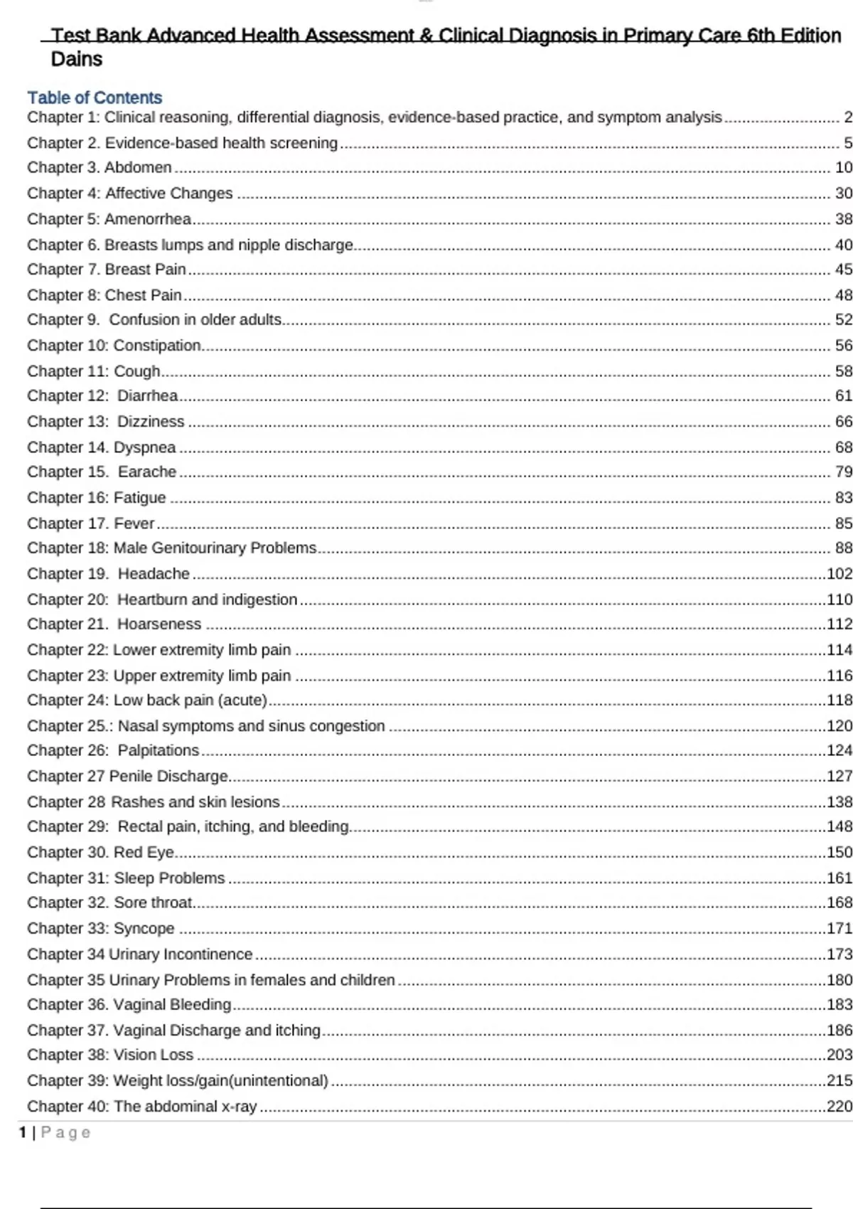 Testbank Advanced Health Assessment Clinical Diagnosis in Primary Care 6th Edition DainsTable of Contents Chapter 1: Clinical reasoning, differential diagnosis, evidence-based practice, and symptom analysis .......................... 2 Chapter 2. Evidence-based health screening ................................................................................................................ 5 Chapter 3. Abdomen ................................................................................................................................................... 10 Chapter 4: Affective Changes ..................................................................................................................................... 30 Chapter 5: Amenorrhea ............................................................................................................................................... 38 Chapter 6. Breasts lumps and nipple discharge........................................................................................................... 40 Chapter 7. Breast Pain ................................................................................................................................................ 45 Chapter 8: Chest Pain ................................................................................................................................................. 48 Chapter 9. Confusion in older adults ........................................................................................................................... 52 Chapter 10: Constipation ............................................................................................................................................. 56 Chapter 11: Cough ...................................................................................................................................................... 58 Chapter 12: Diarrhea .................................................................................................................................................. 61 Chapter 13: Dizziness ................................................................................................................................................ 66 Chapter 14. Dyspnea .................................................................................................................................................. 68 Chapter 15. Earache .................................................................................................................................................. 79 Chapter 16: Fatigue .................................................................................................................................................... 83 Chapter 17. Fever ....................................................................................................................................................... 85 Chapter 18: Male Genitourinary Problems ................................................................................................................... 88 Chapter 19. Headache ..............................................................................................................................................102 Chapter 20: Heartburn and indigestion ......................................................................................................................110 Chapter 21. Hoarseness ...........................................................................................................................................112 Chapter 22: Lower extremity limb pain .......................................................................................................................114 Chapter 23: Upper extremity limb pain .......................................................................................................................116 Chapter 24: Low back pain (acute) .............................................................................................................................118 Chapter 25.: Nasal symptoms and sinus congestion ..................................................................................................120 Chapter 26: Palpitations ............................................................................................................................................124 Chapter 27 Penile Discharge ......................................................................................................................................127 Chapter 28 Rashes and skin lesions ..........................................................................................................................138 Chapter 29: Rectal pain, itching, and bleeding...........................................................................................................148 Chapter 30. Red Eye ..................................................................................................................................................150 Chapter 31: Sleep Problems ......................................................................................................................................161 Chapter 32. Sore throat ..............................................................................................................................................168 Chapter 33: Syncope .................................................................................................................................................171 Chapter 34 Urinary Incontinence ................................................................................................................................173 Chapter 35 Urinary Problems in females and children ................................................................................................180 Chapter 36. Vaginal Bleeding ...............................................................................................................