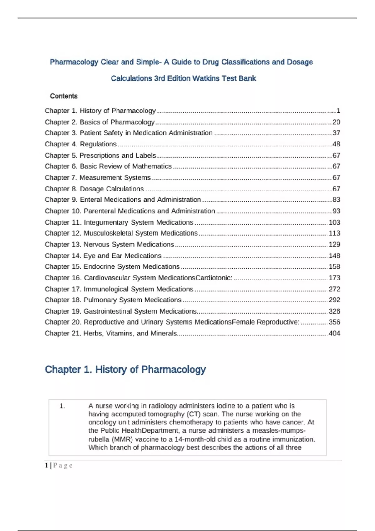 Test Bank Pharmacology Clear and Simple A Guide to Drug Classifications and Dosage Calculations 3rd Edition WatkinsContents Chapter 1. History of Pharmacology ........................................................................................... 1 Chapter 2. Basics of Pharmacology .......................................................................................... 20 Chapter 3. Patient Safety in Medication Administration ............................................................ 37 Chapter 4. Regulations ............................................................................................................. 48 Chapter 5. Prescriptions and Labels ......................................................................................... 67 Chapter 6. Basic Review of Mathematics ................................................................................. 67 Chapter 7. Measurement Systems ............................................................................................ 67 Chapter 8. Dosage Calculations ............................................................................................... 67 Chapter 9. Enteral Medications and Administration .................................................................. 83 Chapter 10. Parenteral Medications and Administration ........................................................... 93 Chapter 11. Integumentary System Medications .................................................................... 103 Chapter 12. Musculoskeletal System Medications .................................................................. 113 Chapter 13. Nervous System Medications .............................................................................. 129 Chapter 14. Eye and Ear Medications .................................................................................... 148 Chapter 15. Endocrine System Medications ........................................................................... 158 Chapter 16. Cardiovascular System Medications Cardiotonic: ................................................ 173 Chapter 17. Immunological System Medications .................................................................... 272 Chapter 18. Pulmonary System Medications .......................................................................... 292 Chapter 19. Gastrointestinal System Medications................................................................... 326 Chapter 20. Reproductive and Urinary Systems Medications Female Reproductive: .............. 356 Chapter 21. Herbs, Vitamins, and Minerals............................................................................. 404 Chapter 1. History of Pharmacology 1. A nurse working in radiology administers iodine to a patient who is having a computed tomography (CT) scan. The nurse working on the oncology unit administers chemotherapy to patients who have cancer. At the Public Health Department, a nurse administers a measles-mumpsrubella (MMR) vaccine to a 14-month-old child as a routine immunization. Which branch of pharmacology best describes the actions of all three 1 | P a g enurses? A) B) C) D) Ans: Pharmacoeconomics Pharmacotherapeutics Pharmacodynamics Pharmacokinetics B Feedback: Pharmacology is the study of the biologic effects of chemicals. Nurses are involved with clinical pharmacology or pharmacotherapeutics, which is a branch of pharmacology that deals with the uses of drugs to treat, prevent, and diagnose disease. The radiology nurse is administering a drug to help diagnose a disease. The oncology nurse is administering a drug to help treat a disease. Pharmacoeconomics includes any costs involved in drug therapy. Pharmacodynamics involves how a drug affects the body and pharmacokinetics is how the body acts on the body. 2. A physician has ordered intramuscular (IM) injections of morphine, a narcotic, every 4 hours as needed for pain in a motor vehicle accident victim. The nurse is aware this drug has a high abuse potential. Under what category would morphine be classified? A) B) C) D) Ans: Schedule I Schedule II Schedule III Schedule IV B 2 | P a g eFeedback: Narcotics with a high abuse potential are classified as Schedule II drugs because of severe dependence liability. Schedule I drugs have high abuse potential and no accepted medical use. Schedule III drugs have a lesser abuse potential than II and an accepted medical use. Schedule IV drugs have low abuse potential and limited dependence liability. 3. A) B) C) D) Ans: When involved in phase III drug evaluation studies, what responsibilities would the nurse have? Working with animals who are given experimental drugs Choosing appropriate patients to be involved in the drug study Monitoring and observing patients closely for adverse effects Conducting research to determine effectiveness of the drug C Feedback: Phase III studies involve use of a drug in a vast clinical population in which patients are asked to record any symptoms they experience while taking the drugs. Nurses may be responsible for helping collect and analyze the information to be shared with the Food and Drug Administration (FDA) but would not conduct research independently because nurses do not prescribe medications. Use of animals in drug testing is done in the preclinical trials. Select patients who are involved in phase II studies to participate in studies where the participants have the disease the drug is intended to treat. These patients are monitored closely for drug action and adverse effects. Phase I studies involve healthy human volunteers who are usually paid for their participation. Nurses may observe for adverse effects and toxicity. 4. A) B) C) D) Ans: What concept is considered when generic drugs are substituted for brand name drugs? Bioavailability Critical concentration Distribution Half-life A Feedback: 3 | P a g eBioavailability is the portion of a dose of a drug that reaches the systemic circulation and is available to act on body cells.