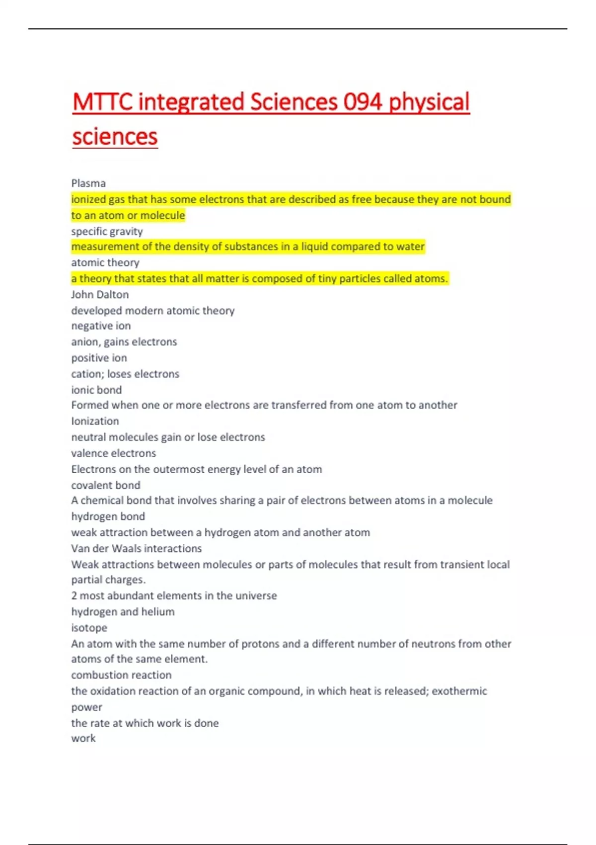 John Dalton developed modern atomic theory negative ion anion, gains electrons positive ion cation; loses electrons ionic bond Formed when one or more electrons are transferred from one atom to another Ionization neutral molecules gain or lose electrons valence electrons Electrons on the outermost energy level of an atom covalent bond A chemical bond that involves sharing a pair of electrons between atoms in a molecule hydrogen bond weak attraction between a hydrogen atom and another atom Van der Waals interactions Weak attractions between molecules or parts of molecules that result from transient local partial charges. 2 most abundant elements in the universe hydrogen and helium isotope An atom with the same number of protons and a different number of neutrons from other atoms of the same element. combustion reaction the oxidation reaction of an organic compound, in which heat is released; exothermic power the rate at which work is done work