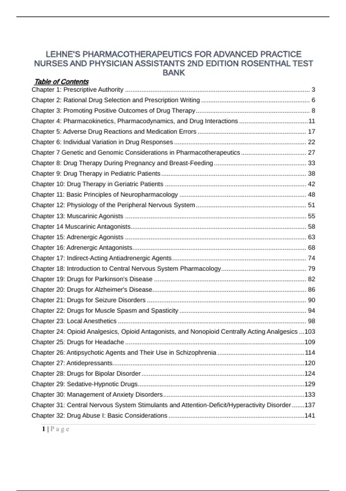 TEST BANK ROSENTHAL LEHNE'S PHARMACOTHERAPEUTICS FOR ADVANCED PRACTICE NURSES AND PHYSICIAN ASSISTANTS 2ND EDITIONTable of Contents Chapter 1: Prescriptive Authority ...................................................................................................... 3 Chapter 2: Rational Drug Selection and Prescription Writing ............................................................ 6 Chapter 3: Promoting Positive Outcomes of Drug Therapy ............................................................... 8 Chapter 4: Pharmacokinetics, Pharmacodynamics, and Drug Interactions ...................................... 11 Chapter 5: Adverse Drug Reactions and Medication Errors ............................................................ 17 Chapter 6: Individual Variation in Drug Responses ......................................................................... 22 Chapter 7 Genetic and Genomic Considerations in Pharmacotherapeutics .................................... 27 Chapter 8: Drug Therapy During Pregnancy and Breast-Feeding ................................................... 33 Chapter 9: Drug Therapy in Pediatric Patients ................................................................................ 38 Chapter 10: Drug Therapy in Geriatric Patients .............................................................................. 42 Chapter 11: Basic Principles of Neuropharmacology ...................................................................... 48 Chapter 12: Physiology of the Peripheral Nervous System ............................................................. 51 Chapter 13: Muscarinic Agonists .................................................................................................... 55 Chapter 14 Muscarinic Antagonists ................................................................................................. 58 Chapter 15: Adrenergic Agonists .................................................................................................... 63 Chapter 16: Adrenergic Antagonists ................................................................................................ 68 Chapter 17: Indirect-Acting Antiadrenergic Agents .......................................................................... 74 Chapter 18: Introduction to Central Nervous System Pharmacology ............................................... 79 Chapter 19: Drugs for Parkinson's Disease .................................................................................... 82 Chapter 20: Drugs for Alzheimer's Disease ..................................................................................... 86 Chapter 21: Drugs for Seizure Disorders ........................................................................................ 90 Chapter 22: Drugs for Muscle Spasm and Spasticity ...................................................................... 94 Chapter 23: Local Anesthetics ........................................................................................................ 98 Chapter 24: Opioid Analgesics, Opioid Antagonists, and Nonopioid Centrally Acting Analgesics ...103 Chapter 25: Drugs for Headache ...................................................................................................109 Chapter 26: Antipsychotic Agents and Their Use in Schizophrenia ................................................ 114 Chapter 27: Antidepressants ..........................................................................................................120 Chapter 28: Drugs for Bipolar Disorder ..........................................................................................124 Chapter 29: Sedative-Hypnotic Drugs ............................................................................................129 Chapter 30: Management of Anxiety Disorders ..............................................................................133 Chapter 31: Central Nervous System Stimulants and Attention-Deficit/Hyperactivity Disorder .......137 Chapter 32: Drug Abuse I: Basic Considerations ...........................................................................141 1 | P a g eChapter 33: Drug Abuse II: Alcohol ................................................................................................145 Chapter 34: Drug Abuse III: Nicotine and Smoking ........................................................................149 Chapter 35: Drug Abuse IV: Major Drugs of Abuse Other Than Alcohol and Nicotine.....................154 Chapter 36: Review of Hemodynamics ..........................................................................................161 Chapter 37: Diuretics .....................................................................................................................164 Chapter 38: Drugs Acting on the Renin-Angiotensin-Aldosterone System .....................................168 Chapter 39: Calcium Channel Blockers .........................................................................................173 Chapter 40: Vasodilators................................................................................................................175 Chapter 41: Drugs for Hypertension ..............................................................................................180 Chapter 42: Drugs for Heart Failure ...............................................................................................187 Chapter 43: Antidysrhythmic Drugs ................................................................................................195 Chapter 44: Prophylaxis of Atherosclerotic Cardiovascular Disease: Drugs That Help Normalize Cholesterol and Triglyceride Levels ...............................................................................................203 Chapter 45: Drugs for Angina Pectoris ...........................................................................................210 Chapter 46: Anticoagulant, Antiplatelet, and Thrombolytic Dru