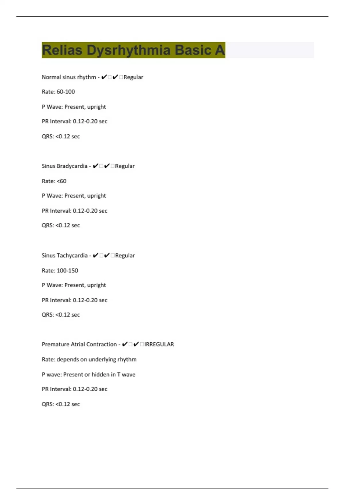 Normal sinus rhythm - ️️Regular Rate: 60-100 P Wave: Present, upright PR Interval: 0.12-0.20 sec QRS: <0.12 sec Sinus Bradycardia - ️️Regular Rate: <60 P Wave: Present, upright PR Interval: 0.12-0.20 sec QRS: <0.12 sec Sinus Tachycardia - ️️Regular Rate: 100-150 P Wave: Present, upright PR Interval: 0.12-0.20 sec QRS: <0.12 sec Premature Atrial Contraction - ️️IRREGULAR Rate: depends on underlying rhythm P wave: Present or hidden in T wave PR Interval: 0.12-0.20 sec QRS: <0.12 sec