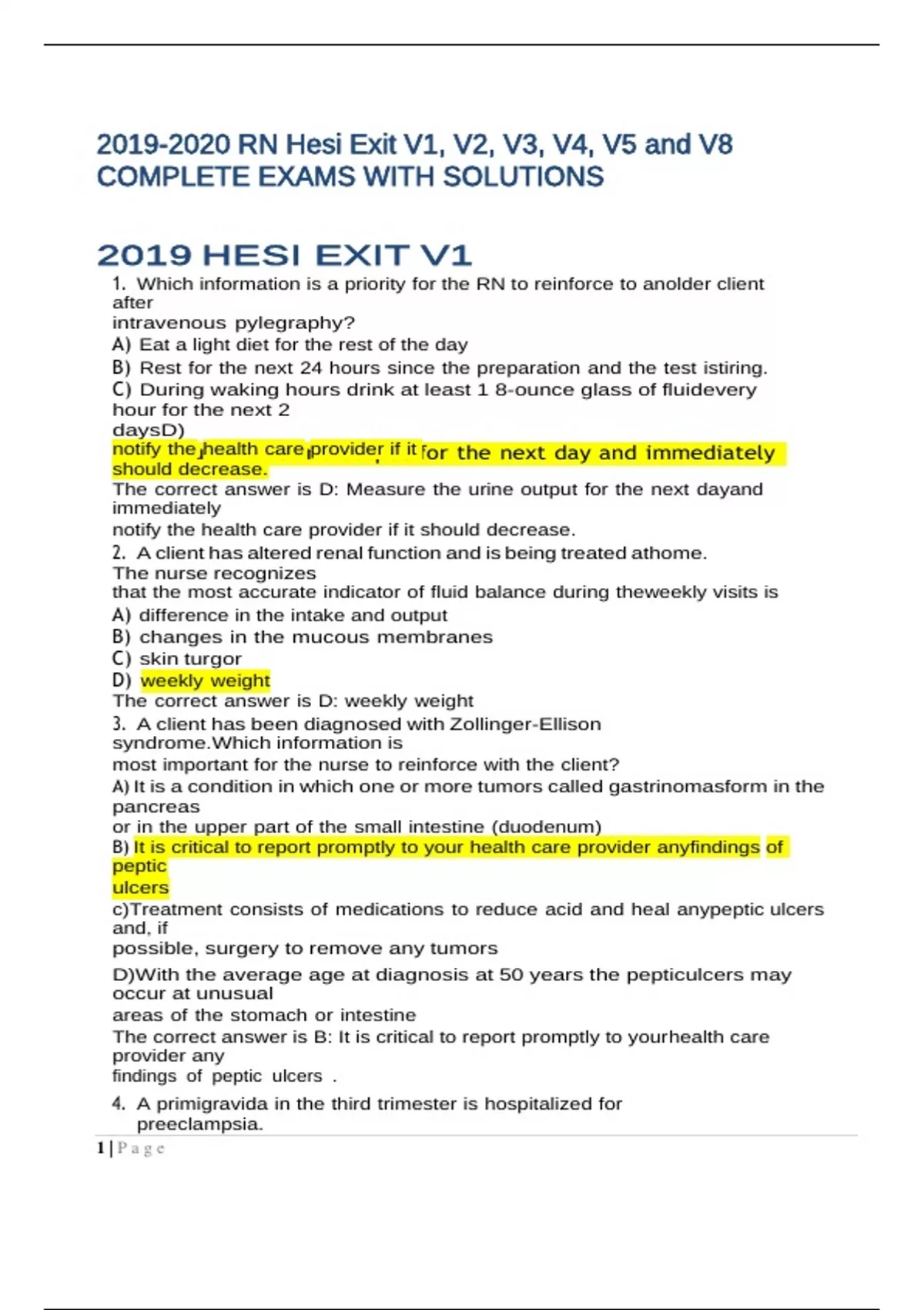 RN Hesi Exit V1, V2, V3, V4, V5 and V8 COMPLETE EXAMS WITH SOLUTIONS2019 HESI EXIT V1 1. Which information is a priority for the RN to reinforce to an older client after intravenous pylegraphy? A) Eat a light diet for the rest of the day B) Rest for the next 24 hours since the preparation and the test is tiring. C) During waking hours drink at least 1 8-ounce glass of fluid every hour for the next 2 days D) notify the health care provider if it should decrease. The correct answer is D: Measure the urine output for the next day and immediately notify the health care provider if it should decrease. 2. A client has altered renal function and is being treated at home. The nurse recognizes that the most accurate indicator of fluid balance during the weekly visits is A) difference in the intake and output B) changes in the mucous membranes C) skin turgor D) weekly weight The correct answer is D: weekly weight 3. A client has been diagnosed with Zollinger-Ellison syndrome.Which information is most important for the nurse to reinforce with the client? A) It is a condition in which one or more tumors called gastrinomas form in the pancreas or in the upper part of the small intestine (duodenum) B) It is critical to report promptly to your health care provider any findings of peptic ulcers c)Treatment consists of medications to reduce acid and heal any peptic ulcers and, if possible, surgery to remove any tumors D)With the average age at diagnosis at 50 years the peptic ulcers may occur at unusual areas of the stomach or intestine The correct answer is B: It is critical to report promptly to your health care provider any findings of peptic ulcers . 4. A primigravida in the third trimester is hospitalized for preeclampsia. Measure the urine output for the next day and immediately 1 | P a g eThe nurse determines that the client’s blood pressure is increasing. Which action should the nurse take first? A) Check the protein level in urine B) Have the client turn to the left side C) Take the temperature D) Monitor the urine output The correct answer is B: Have the client turn to the left side 5. The nurse is caring for a client in atrial fibrillation. The atrial heart rate is 250 and the ventricular rate is controlled at 75. Which of the following findings is cause for the most concern? A) Diminished bowel sounds B) Loss of appetite C) A cold, pale lower leg D) Tachypnea The correct answer is C: A cold, pale lower leg 6. The client with infective endocarditis must be assessed frequently by the home health nurse. Which finding suggests that antibiotic therapy is not effective, and must be reported by the nurse immediately to the healthcare provider? A) Nausea and vomiting B) Fever of 103 degrees Fahrenheit (39.5 degrees Celsius) C) Diffuse macular rash D) Muscle tenderness The correct answer is B: Fever of 103 degrees F (39.5 degrees C) 7. A client who had a vasectomy is in the post recovery unit at an outpatient clinic. Which of these points is most important to be reinforced by the nurse? A) Until the health care provider has determined that your ejaculate doesn't contain sperm, continue to use another form of contraception. B) This procedure doesn't impede the production of male hormones or the production of sperm in the testicles. The sperm can no longer enter your semen and no sperm are in your ejaculate. C) After your vasectomy, strenuous activity needs to be avoided for at least 48 hours. Ifyour work doesn't involve hard physical labor, you can return to your job as soon as you feel up to it. The stitches generally dissolve in seven to ten days. D) The health care provider at this clinic recommends rest, ice, an athletic supporter or over-the-counter pain medication to relieve any discomfort. The correct answer is A: Until the health care provider has determined that your 2 | P a g eejaculate doesn't contain sperm, continue to use another form of contraception. 8. A client who is to have antineoplastic chemotherapy tells the nurses of a fear of being sick all the time and wishes to try acupuncture. Which of these beliefs stated by the client would be incorrect about acupuncture? A) Some needles go as deep as 3 inches, depending on where they're placed in the body and what the treatment is for. The needles usually are left in for 15 to 30 minutes. B) In traditional Chinese medicine, imbalances in the basic energetic flow of life — known as qi or chi — are thought to cause illness. * C) The flow of life is believed to flow through major pathways or nerve clusters in your body. D) By inserting extremely fine needles into some of the over 400 acupuncture points in various combinations it is believed that energy flow will rebalance to allow the body's natural healing mechanisms to take over. The correct answer is C: The flow of life is believed to flow through major pathways or nerve clusters in your body. 9. The nurse is discussing with a group of students the disease Kawasaki. What statement made by a student about Kawasaki disease is incorrect? A)It also called mucocutaneous lymph node syndrome because it affects the mucous membranes (inside the mouth, throat and nose), skin and lymph nodes. B)In the second phase of the disease, findings include peeling of the skin on the hands and feet with joint and abdominal pain C) Kawasaki disease occurs most often in boys, children younger than age 5 and children of Hispanic descent D) Initially findings are a sudden high fever, usually above 104 degrees Fahrenheit, which lasts 1 to2 weeks The correct answer is C: Kawasaki disease occurs most often in boys, children younger than age 5 and children of Hispanic descent 10. A client has viral pneumonia affecting 2/3 of the right lung. What would be the best position to teach the client to lie in every other hour during first 12 hours after admission? 3 | P a g eA) Side-lying on the left with the head elevated 10 degrees B) Side-lying on the left with the head elevated 35 degrees C) Side-lying on the right wi