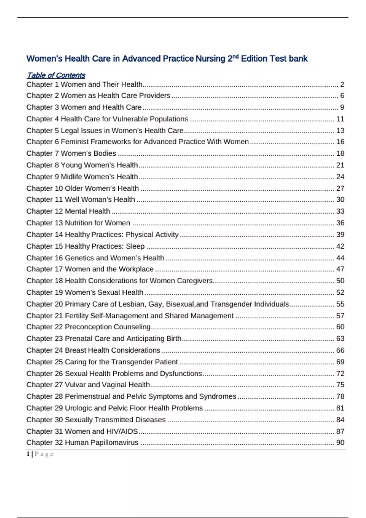 Test Bank Women’s Health Care in Advanced Practice Nursing 2nd EditionTable of Contents Chapter 1 Women and Their Health ............................................................................................... 2 Chapter 2 Women as Health Care Providers ................................................................................. 6 Chapter 3 Women and Health Care ............................................................................................... 9 Chapter 4 Health Care for Vulnerable Populations ...................................................................... 11 Chapter 5 Legal Issues in Women’s Health Care ......................................................................... 13 Chapter 6 Feminist Frameworks for Advanced Practice With Women ......................................... 16 Chapter 7 Women’s Bodies ......................................................................................................... 18 Chapter 8 Young Women’s Health ............................................................................................... 21 Chapter 9 Midlife Women’s Health ............................................................................................... 24 Chapter 10 Older Women’s Health .............................................................................................. 27 Chapter 11 Well Woman’s Health ................................................................................................ 30 Chapter 12 Mental Health ............................................................................................................ 33 Chapter 13 Nutrition for Women .................................................................................................. 36 Chapter 14 Healthy Practices: Physical Activity ........................................................................... 39 Chapter 15 Healthy Practices: Sleep ........................................................................................... 42 Chapter 16 Genetics and Women’s Health .................................................................................. 44 Chapter 17 Women and the Workplace ....................................................................................... 47 Chapter 18 Health Considerations for Women Caregivers........................................................... 50 Chapter 19 Women’s Sexual Health ............................................................................................ 52 Chapter 20 Primary Care of Lesbian, Gay, Bisexual, and Transgender Individuals ...................... 55 Chapter 21 Fertility Self-Management and Shared Management ................................................ 57 Chapter 22 Preconception Counseling ......................................................................................... 60 Chapter 23 Prenatal Care and Anticipating Birth .......................................................................... 63 Chapter 24 Breast Health Considerations .................................................................................... 66 Chapter 25 Caring for the Transgender Patient ........................................................................... 69 Chapter 26 Sexual Health Problems and Dysfunctions ................................................................ 72 Chapter 27 Vulvar and Vaginal Health ......................................................................................... 75 Chapter 28 Perimenstrual and Pelvic Symptoms and Syndromes ............................................... 78 Chapter 29 Urologic and Pelvic Floor Health Problems ............................................................... 81 Chapter 30 Sexually Transmitted Diseases ................................................................................. 84 Chapter 31 Women and HIV/AIDS ............................................................................................... 87 Chapter 32 Human Papillomavirus .............................................................................................. 90 1 | P a g eChapter 33 Gynecologic Cancers ................................................................................................ 92 Chapter 34 Menopause ............................................................................................................... 95 Chapter 35 Osteoporosis ............................................................................................................. 98 Chapter 36 The Challenge of Unintended Pregnancies ............................................................. 100 Chapter 37 Infertility ................................................................................................................... 103 Chapter 38 High-Risk Childbearing ............................................................................................ 105 Chapter 39 Intrapartum and Postpartum Care ........................................................................... 110 Chapter 40 Mental Health Challenges ....................................................................................... 114 Chapter 41 Substance Abuse and Women ................................................................................ 117 Chapter 42 Gender-Based Violence and Women’s Health ........................................................ 120 Chapter 43 Cardiovascular Disease in Women .......................................................................... 124 Chapter 44 Endocrine-Related Problems ................................................................................... 128 Chapter 45 Chronic Illness and Women ..................................................................................... 130 Chapter 46 Care of Women With Disabilities ............................................................................. 132 Chapter 1 Women and Their Health The United States ranks 50th in the world for maternal mor