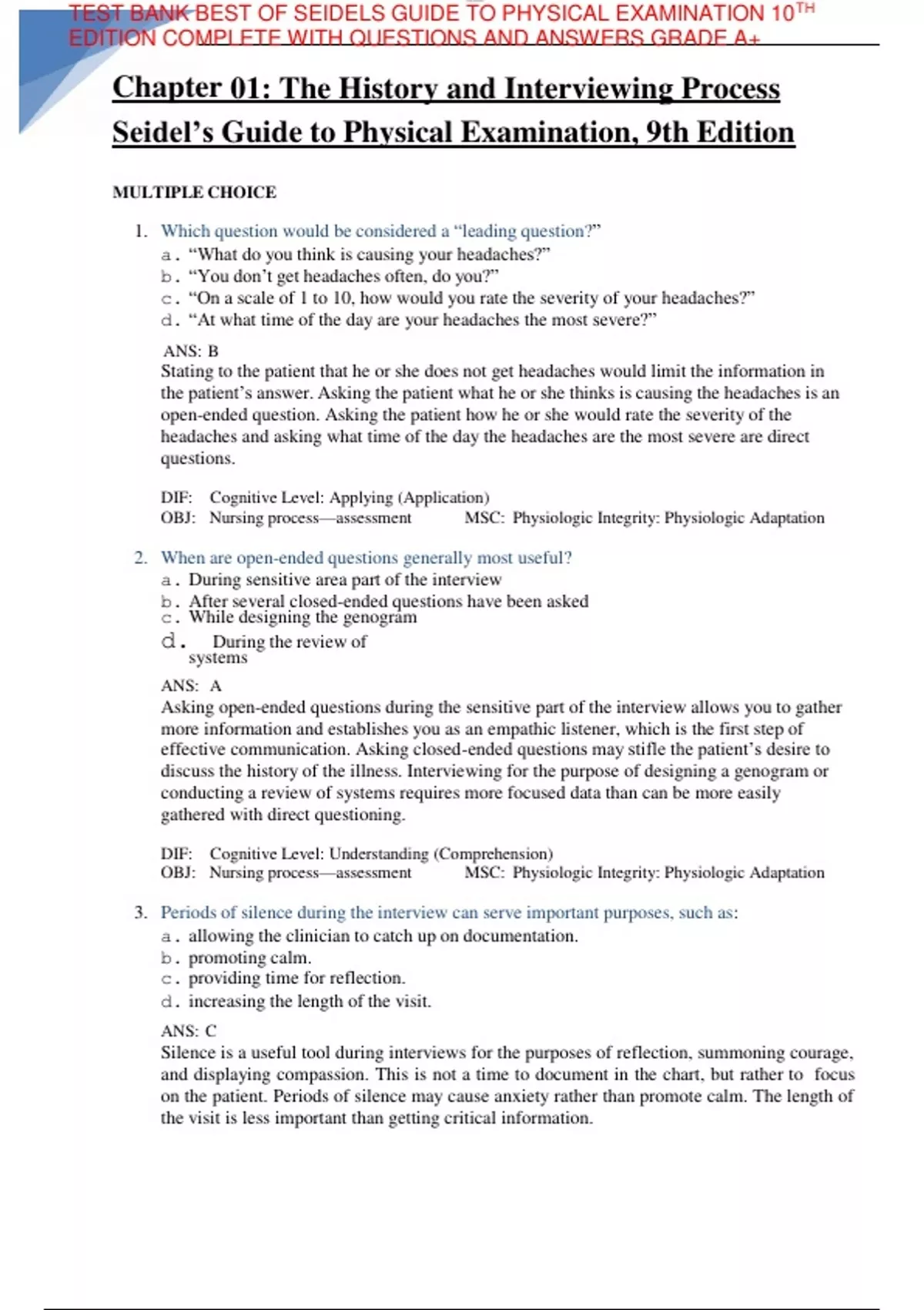 Chapter 01: The History and Interviewing Process Seidel’s Guide to Physical Examination, 9th Edition MULTIPLE CHOICE 1. Which question would be considered a “leading question?” a. “What do you think is causing your headaches?” b. “You don’t get headaches often, do you?” c. “On a scale of 1 to 10, how would you rate the severity of your headaches?” d. “At what time of the day are your headaches the most severe?” ANS: B Stating to the patient that he or she does not get headaches would limit the information in the patient’s answer. Asking the patient what he or she thinks is causing the headaches is an open-ended question. Asking the patient how he or she would rate the severity of the headaches and asking what time of the day the headaches are the most severe are direct questions. DIF: Cognitive Level: Applying (Application) OBJ: Nursing process—assessment MSC: Physiologic Integrity: Physiologic Adaptation 2. When are open-ended questions generally most useful? a. During sensitive area part of the interview b. After several closed-ended questions have been asked c. While designing the genogram d. During the review of systems ANS: A Asking open-ended questions during the sensitive part of the interview allows you to gather more information and establishes you as an empathic listener, which is the first step of effective communication. Asking closed-ended questions may stifle the patient’s desire to discuss the history of the illness. Interviewing for the purpose of designing a genogram or conducting a review of systems requires more focused data than can be more easily gathered with direct questioning. DIF: Cognitive Level: Understanding (Comprehension) OBJ: Nursing process—assessment MSC: Physiologic Integrity: Physiologic Adaptation 3. Periods of silence during the interview can serve important purposes, such as: a. allowing the clinician to catch up on documentation. b. promoting calm. c. providing time for reflection. d. increasing the length of the visit. ANS: C Silence is a useful tool during interviews for the purposes of reflection, summoning courage, and displaying compassion. This is not a time to document in the chart, but rather to focus on the patient. Periods of silence may cause anxiety rather than promote calm. The length of the visit is less important than getting critical information. lOMoARcPSD| DIF: Cognitive Level: Understanding (Comprehension) OBJ: Nursing process—assessment MSC: Physiologic Integrity: Physiologic Adaptation 4. Mr. Franklin is speaking with you, the healthcare provider, about his respiratory problem. Mr. Franklin says, “I’ve had this cough for 3 days, and it’s getting worse.” You reply, “Tell me more about your cough.” Mr. Franklin states, “I wish I could tell you more. That’s why I’m here. You tell me what’s wrong!” Which caregiver response would be most appropriate for enhancing communication? a. “After 3 days, you’re tired of coughing. Have you had a fever?” b. “I’d like to hear more about your experiences. Where were you born?” c. “I don’t know what’s wrong. You could have almost any disease.” d. “I’ll examine you and figure out later what the problem is.” ANS: A “After 3 days, you’re tired of coughing. Have you had a fever?” is the only response aimed at focusing on the chief compliant to gather more data and does not digress from the issue. DIF: Cognitive Level: Analyzing (Analysis) OBJ: Nursing process—assessment MSC: Physiologic Integrity: Physiologic Adaptation 5. After you ask a patient about her family history, she says, “Tell me about your family now.” Which response is generally most appropriate? a. Ignore the patient’s comment and continue with the interview. b. Give a brief, undetailed answer. c. Ask the patient why she needs to know. d. Tell the patient that you do not discuss your family with patients. ANS: Giving a brief, undetailed answer will satisfy the patient’s curiosity about yourself without invading your private life. Ignoring the patient’s comment, continuing with the interview, and telling the patient that you do not discuss your family with patients will potentially anger or frustrate her and keep her from sharing openly. Asking the patient why she needs to know will distract from the real reason she is seeking care and instead move the interview conversation away from the topics that should be discussed. DIF: Cognitive Level: Applying (Application) OBJ: Nursing process—assessment MSC: Physiologic Integrity: Physiologic Adaptation 6. A 36-year-old woman complains that she has had crushing chest pain for the past 2 days. She seems nervous as she speaks to you. An appropriate response is to: a. continue to collect information regarding the chief complaint in an unhurried manner. b. finish the interview as rapidly as possible. c. ask the patient to take a deep breath and calm down. d. ask the patient if she wants to wait until another day to talk to you. ANS: A lOMoARcPSD| With an anxious, vulnerable patient, it is best to not hurry; a calm demeanor will communicate caring to the patient. If you as a healthcare provider are hurried, the patient will be more anxious. The best way to assist an anxious patient is to not hurry and remain calm, because this will communicate caring to the patient. Asking the patient if she wants to wait until another day to talk to you delays the needed health care. DIF: Cognitive Level: Applying (Application) OBJ: Nursing process—assessment MSC: Physiologic Integrity: Physiologic Adaptation 7. Ms. A states, “My life is just too painful. It isn’t worth it.” She appears depressed. Which one of the following statements is the most appropriate caregiver response? a. “Try to think about the good things in life.” b. “What in life is causing you such pain?” c. “You can’t mean what you’re saying.” d. “If you think about it, nothing is worth getting this upset about.” ANS: B Spe