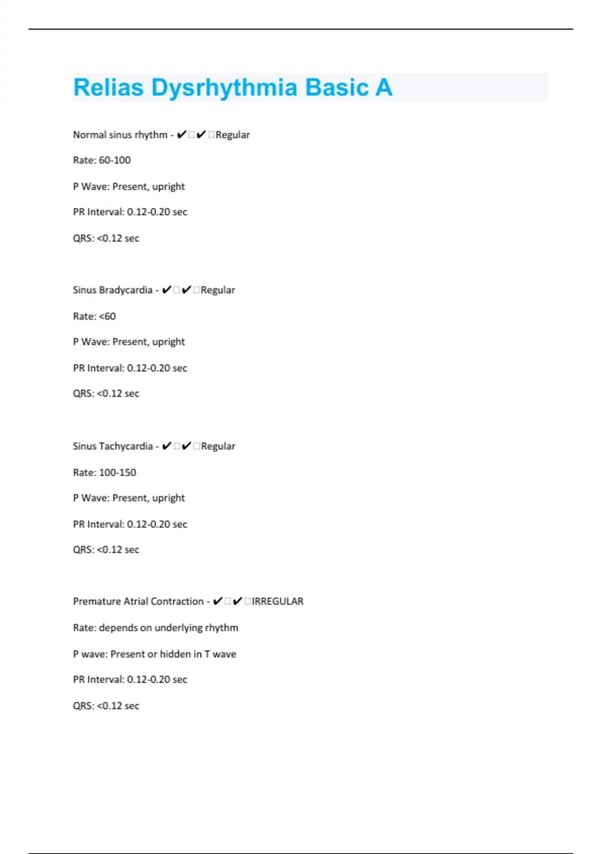 Normal sinus rhythm - ️️Regular Rate: 60-100 P Wave: Present, upright PR Interval: 0.12-0.20 sec QRS: <0.12 sec Sinus Bradycardia - ️️Regular Rate: <60 P Wave: Present, upright PR Interval: 0.12-0.20 sec QRS: <0.12 sec Sinus Tachycardia - ️️Regular Rate: 100-150 P Wave: Present, upright PR Interval: 0.12-0.20 sec QRS: <0.12 sec Premature Atrial Contraction - ️️IRREGULAR Rate: depends on underlying rhythm P wave: Present or hidden in T wave PR Interval: 0.12-0.20 sec QRS: <0.12 sec