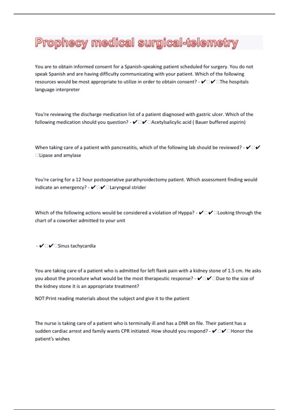You are to obtain informed consent for a Spanish-speaking patient scheduled for surgery. You do not speak Spanish and are having difficulty communicating with your patient. Which of the following resources would be most appropriate to utilize in order to obtain consent? - ️️The hospitals language interpreter You're reviewing the discharge medication list of a patient diagnosed with gastric ulcer. Which of the following medication should you question? - ️️Acetylsalicylic acid ( Bauer buffered aspirin) When taking care of a patient with pancreatitis, which of the following lab should be reviewed? - ️️Lipase and amylase You're caring for a 12 hour postoperative parathyroidectomy patient. Which assessment finding would indicate an emergency? - ️️Laryngeal strider Which of the following actions would be considered a violation of Hyppa? - ️️Looking through the chart of a coworker admitted to your unit - ️️Sinus tachycardia You are taking care of a patient who is admitted for left flank pain with a kidney stone of 1.5 cm. He asks you about the procedure what would be the most therapeutic response? - ️️Due to the size of the kidney stone it is an appropriate treatment? NOT:Print reading materials about the subject and give it to the patient The nurse is taking care of a patient who is terminally ill and has a DNR on file. Their patient has a sudden cardiac arrest and family wants CPR initiated. How should you respond? - ️️Honor the patient's wishes