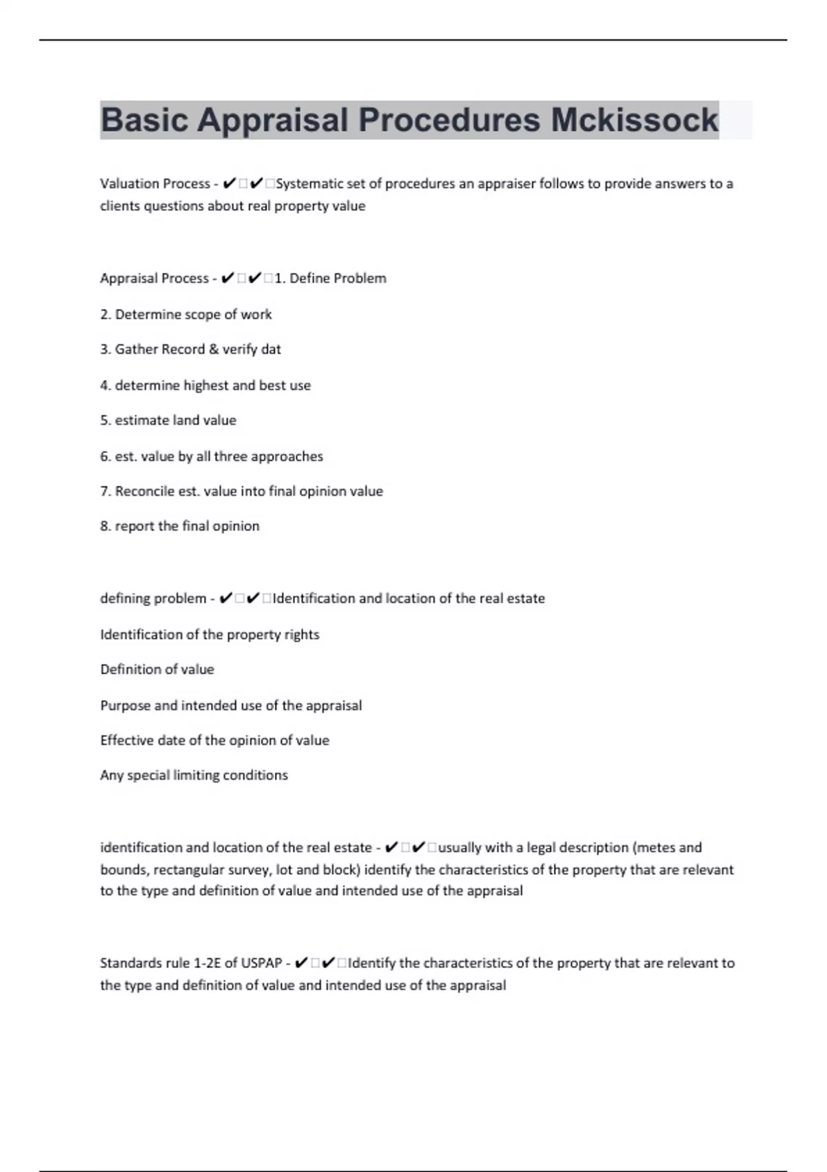 Valuation Process - ️️Systematic set of procedures an appraiser follows to provide answers to a clients questions about real property value Appraisal Process - ️️1. Define Problem 2. Determine scope of work 3. Gather Record & verify dat 4. determine highest and best use 5. estimate land value 6. est. value by all three approaches 7. Reconcile est. value into final opinion value 8. report the final opinion defining problem - ️️Identification and location of the real estate Identification of the property rights Definition of value Purpose and intended use of the appraisal Effective date of the opinion of value Any special limiting conditions identification and location of the real estate - ️️usually with a legal description (metes and bounds, rectangular survey, lot and block) identify the characteristics of the property that are relevant to the type and definition of value and intended use of the appraisal Standards rule 1-2E of USPAP - ️️Identify the characteristics of the property that are relevant to the type and definition of value and intended use of the appraisal