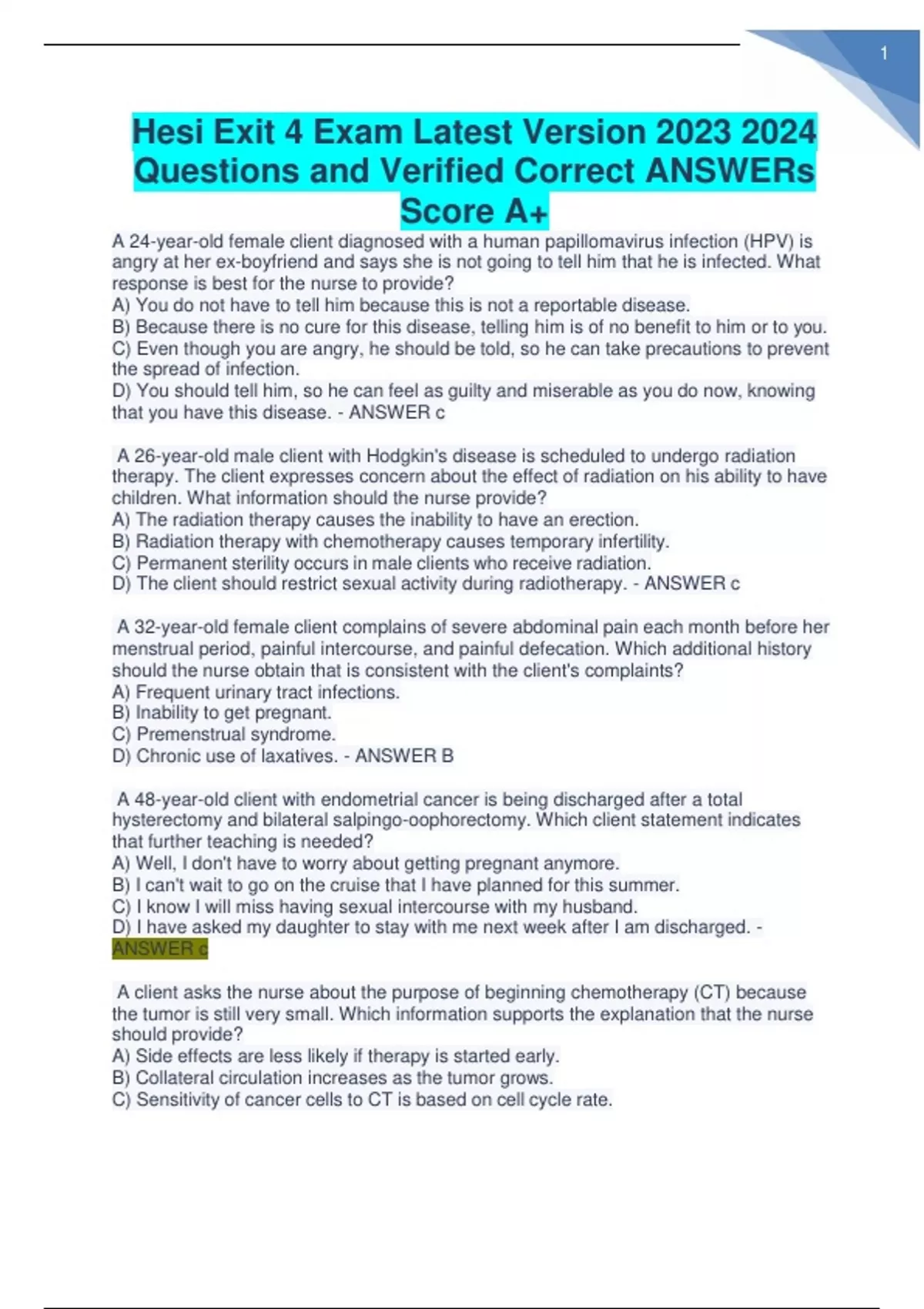 Hesi Exit 4 Exam Latest Version Questions and Verified Correct ANSWERs Score A+/Hesi Exit 4 Exam Latest Version Questions and Verified Correct ANSWERs Score A+/Hesi Exit 4 Exam Latest Version Questions and Verified Correct ANSWERs Score A+/Hesi Exit 4 Exam Latest Version Questions and Verified Correct ANSWERs Score A+/Hesi Exit 4 Exam Latest Version Questions and Verified Correct ANSWERs Score A+