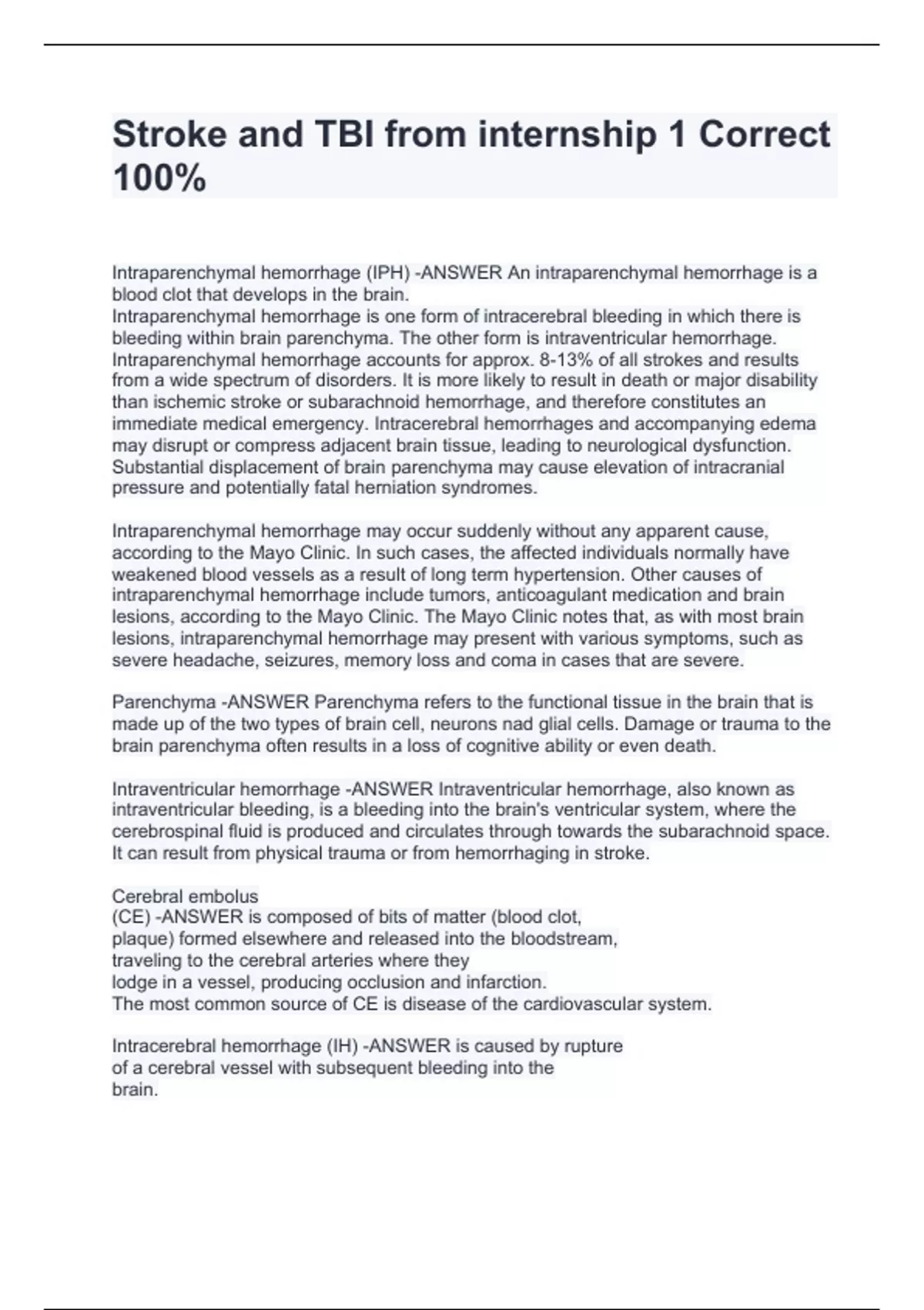 Intraparenchymal hemorrhage (IPH) -ANSWER An intraparenchymal hemorrhage is a blood clot that develops in the brain. Intraparenchymal hemorrhage is one form of intracerebral bleeding in which there is bleeding within brain parenchyma. The other form is intraventricular hemorrhage. Intraparenchymal hemorrhage accounts for approx. 8-13% of all strokes and results from a wide spectrum of disorders. It is more likely to result in death or major disability than ischemic stroke or subarachnoid hemorrhage, and therefore constitutes an immediate medical emergency. Intracerebral hemorrhages and accompanying edema may disrupt or compress adjacent brain tissue, leading to neurological dysfunction. Substantial displacement of brain parenchyma may cause elevation of intracranial pressure and potentially fatal herniation syndromes. Intraparenchymal hemorrhage may occur suddenly without any apparent cause, according to the Mayo Clinic. In such cases, the affected individuals normally have weakened blood vessels as a result of long term hypertension. Other causes of intraparenchymal hemorrhage include tumors, anticoagulant medication and brain lesions, according to the Mayo Clinic. The Mayo Clinic notes that, as with most brain lesions, intraparenchymal hemorrhage may present with various symptoms, such as severe headache, seizures, memory loss and coma in cases that are severe. Parenchyma -ANSWER Parenchyma refers to the functional tissue in the brain that is made up of the two types of brain cell, neurons nad glial cells. Damage or trauma to the brain parenchyma often results in a loss of cognitive ability or even death. Intraventricular hemorrhage -ANSWER Intraventricular hemorrhage, also known as intraventricular bleeding, is a bleeding into the brain's ventricular system, where the cerebrospinal fluid is produced and circulates through towards the subarachnoid space. It can result from physical trauma or from hemorrhaging in stroke. Cerebral embolus (CE) -ANSWER is composed of bits of matter (blood clot, plaque) formed elsewhere and released into the bloodstream, traveling to the cerebral arteries where they lodge in a vessel, producing occlusion and infarction. The most common source of CE is disease of the cardiovascular system. Intracerebral hemorrhage (IH) -ANSWER is caused by rupture of a cerebral vessel with subsequent bleeding into the brain. Primary cerebral hemorrhage -ANSWER (nontraumatic spontaneous hemorrhage) typically occurs in small blood vessels weakened by atherosclerosis producing an aneurysm. Subarachnoid hemorrhage (SH) -ANSWER occurs from bleeding into the subarachnoid space typically from a saccular or berry aneurysm affecting primarily large blood vessels. Arteriovenous malformation (AVM) -ANSWER is another congenital defect that can result in stroke. AVM is characterized by a tortuous tangle of arteries and veins with agenesis of an interposing capillary system. The abnormal vessels undergo progressive dilation with age and eventually bleed in about 50% of cases. Clinical signs of elevating intracranial pressure (ICP) -ANSWER include decreasing level of consciousness (stupor and coma), widened pulse pressure, increased heart rate, irregular respirations (Cheyne-Stokes respirations), vomiting, unreacting pupils (cranial nerve [CN] III signs), and papilledema. Cerebral edema is the most frequent cause of death in acute stroke and is characteristic of large infarcts involving the middle cerebral artery and the internal carotid artery. Transient ischemic attack (TIA) -ANSWER the temporary interruption of blood supply to the brain. Symptoms of focal neurological deficit may last for only a few minutes or for several hours, but by definition do not last longer than 24 hours. After the attack is over there is no evidence of residual brain damage or permanent neurological dysfunction. TIAs may result from a number of different etiological factors, including occlusive episodes, emboli, reduced cerebral perfusion (arrhythmias, decreased cardiac output, hypotension, overmedication with antihypertensive medications, subclavian steal syndrome), or cerebrovascular spasm. The major clinical significance of TIA is as a precursor to susceptibility for both cerebral infarction and myocardial infarction. Approximately 15% of all strokes are preceded by a TIA, with the greatest risk of occurrence within 90 days.1 Anterior Cerebral Artery Syndrome -ANSWER is the first and smaller of two terminal branches of the internal carotid artery. It supplies the medial aspect of the cerebral hemisphere (frontal and parietal lobes) and subcortical structures, including the basal ganglia (anterior internal capsule, inferior caudate nucleus), anterior fornix, and anterior four-fifths of the corpus callosum (Fig. 15.3). Because 650 651the anterior communicating artery allows perfusion of the proximal ACA from either side, occlusion proximal to this point results in minimal deficit. More distal lesions produce more significant deficits. Table 15.1 presents the clinical manifestations of anterior cerebral artery (ACA) syndrome. The most common characteristics of ACA syndrome include contralateral hemiparesis and sensory loss with greater involvement of the lower extremity (LE) than the upper extremity (UE) because the somatotopic organization of the medial aspect of the cortex includes the functional area for the LE. Middle Cerebral Artery Syndrome -ANSWER The middle cerebral artery (MCA) is the second of the two main branches of the internal carotid artery and supplies the entire lateral aspect of the cerebral hemisphere (frontal, temporal, and parietal lobes) and subcortical structures, including the internal capsule (posterior portion), corona radiata, globus pallidus (outer part), most of the caudate nucleus, and the putamen (Fig. 15.4). Occlusion of the proximal MCA produces extensive neurological damage with significant cerebral edema. Increased intracranial pressures typically lead to loss of consciousnes