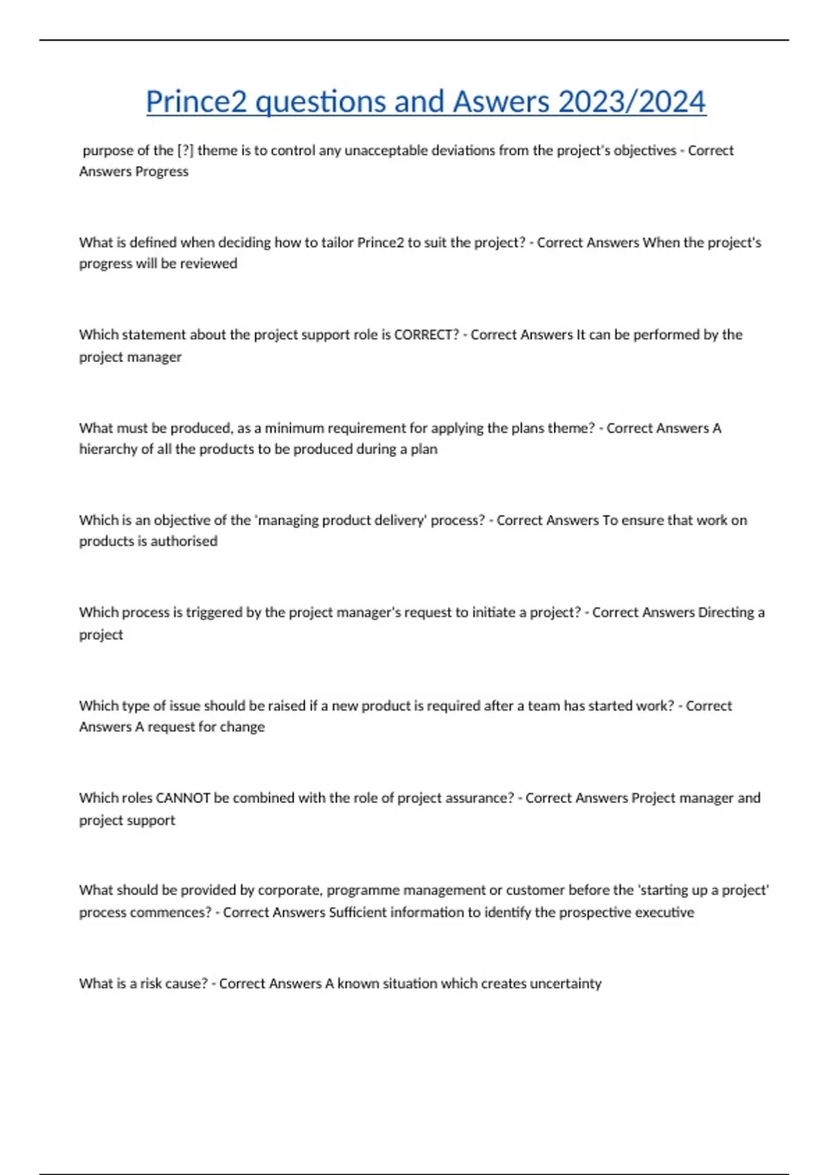purpose of the [?] theme is to control any unacceptable deviations from the project's objectives - Correct Answers Progress What is defined when deciding how to tailor Prince2 to suit the project? - Correct Answers When the project's progress will be reviewed Which statement about the project support role is CORRECT? - Correct Answers It can be performed by the project manager What must be produced, as a minimum requirement for applying the plans theme? - Correct Answers A hierarchy of all the products to be produced during a plan Which is an objective of the 'managing product delivery' process? - Correct Answers To ensure that work on products is authorised Which process is triggered by the project manager's request to initiate a project? - Correct Answers Directing a project Which type of issue should be raised if a new product is required after a team has started work? - Correct Answers A request for change Which roles CANNOT be combined with the role of project assurance? - Correct Answers Project manager and project support What should be provided by corporate, programme management or customer before the 'starting up a project' process commences? - Correct Answers Sufficient information to identify the prospective executive What is a risk cause? - Correct Answers A known situation which creates uncertainty What must be used, as a minimum requirement for applying the progress theme? - Correct Answers Stage authorisation What must be recorded in the quality management approach, as a minimum requirement for applying the quality theme? - Correct Answers The approach to managing project assurance Quality [?] defines the type of quality methods the project will use - Correct Answers Planning Which is an objective of the 'managing a stage boundary' process? - Correct Answers To review and, if necessary, update the project initiation documentation Which activity can take place within the 'managing a stage boundary' process? - Correct Answers Produce an exception plan What does the 'initiating a project' process provide? - Correct Answers Information for the project board to decide if the project is aligned to business objectives Which is a purpose of an End Stage Report? - Correct Answers Summarise progress to enable the PB to decide what action to take next Which is part of quality control? - Correct Answers Produce quality records to show that the planned quality activities have been carried out When are tolerances for a Work Package agreed? - Correct Answers When accepting a Work Package Which product is used by the PM to authorise work? - Correct Answers Work Package From whom does a TM obtain approval for a completed product? - Correct Answers The authority defined in the Product Description What is the first step in the recommended risk management procedure? - Correct Answers Identify A stakeholder is anyone who thinks they will be affected by a project and a stakeholder may be internal or external to the corporate organisation - Correct Answers TRUE Which is a minimum requirement for applying the organisation theme? - Correct Answers To define the approach to engaging with stakeholders Which statement about the 'continued business justification' principle is CORRECT? - Correct Answers The chosen option must provide value for money Which regular report provides the project board with a summary of stage status? - Correct Answers Highlight report Which is a purpose of a project brief? - Correct Answers To document a common understanding of the starting point for the project In which process are team plans produced? - Correct Answers Managing product delivery How is the 'learn from experience' principle applied? - Correct Answers By reviewing the management of previous projects Is a checkpoint report time-driven or event-driven? - Correct Answers Time-driven When should the project board request a decision from corporate, programme management or customer? - Correct Answers If it is forecast that project level tolerance will be exceeded Which is a reason why the 'defined roles and responsibilities' principle must be applied? - Correct Answers Because more than one function may be involved in the project Which is an objective of the 'starting up a project' process? - Correct Answers To confirm that there are no known restrictions that would prevent the project from being delivered Which principle is being applied when a project product description is produced? - Correct Answers Focus on products Which is a minimum requirement for applying the risk theme? - Correct Answers Identified threats and opportunities must be documented Which statements apply to a stage plan? - Correct Answers It is produced close to the time when the planned events will take place and it provides the basis for day-to-day control by the project manager Which is a purpose of the benefits management approach? - Correct Answers To provide a schedule for measuring the achievement of benefits Which is assumed to be the customer's responsibility in the Prince2 customer/supplier environment - Correct Answers To specify the desired result Which is a purpose of the risk management approach? - Correct Answers To define the techniques to be used when assessing project risks Which management product should always be updated when a product fails its quality check? - Correct Answers Quality register The purpose of the [?] process is to establish solid foundations for the project - Correct Answers Initiating a project Which two statements about tailoring are CORRECT? - Correct Answers Processes can be simplified or carried out in more detail and terminology can be changed to suit organisational standards Which characteristic distinguishes a project from regular business operations? - Correct Answers It introduces business change Which process is used by a TM to coordinate work on one or more of the project's products? - Correct Answers Managing product delivery Who does the senior user represent when making decisions? - Correct An