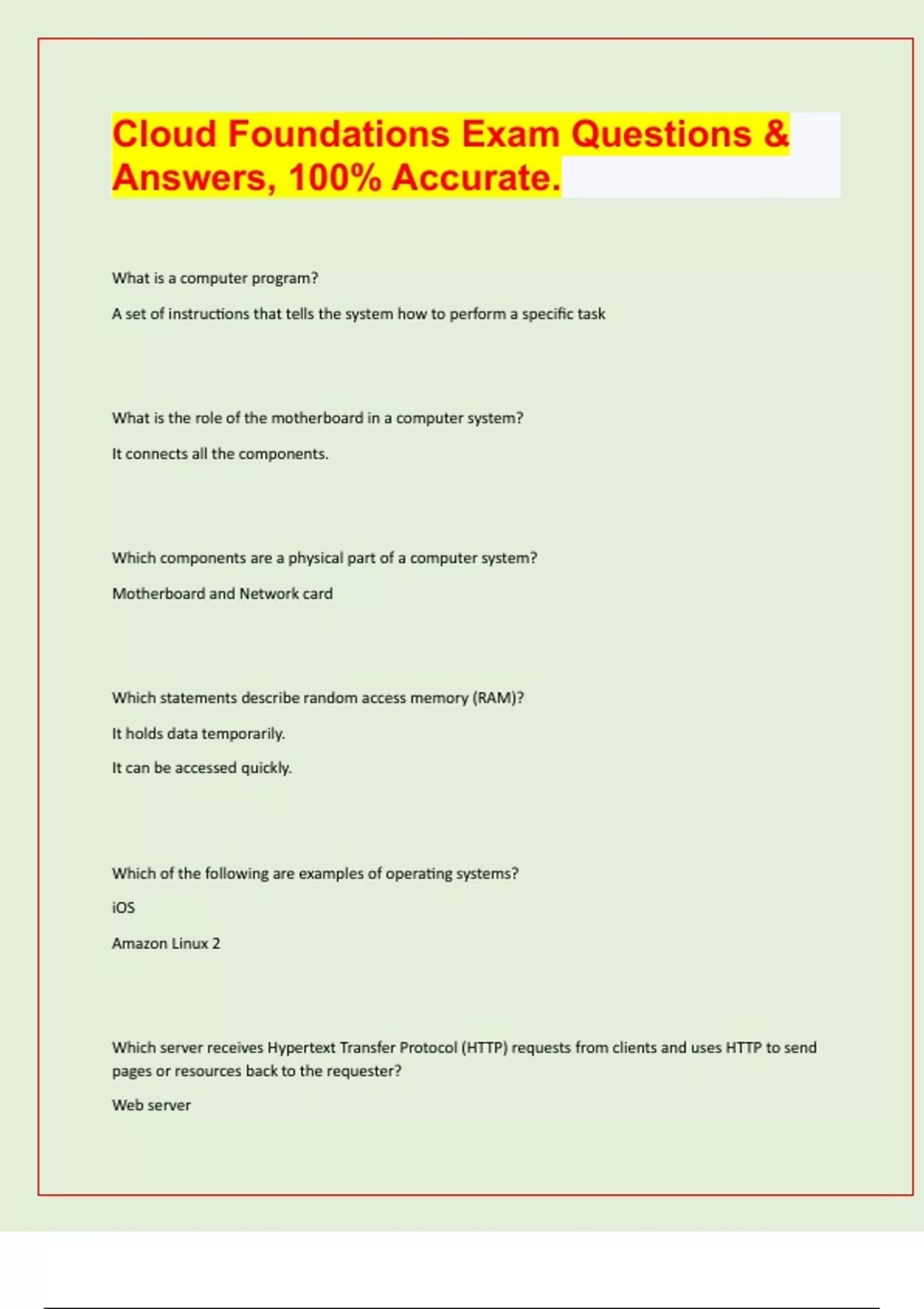 Cloud Foundations Exam Questions & Answers, 100% Accurate. What is a computer program? A set of instructions that tells the system how to perform a specific task What is the role of the motherboard in a computer system? It connects all the components. Which components are a physical part of a computer system? Motherboard and Network card Which statements describe random access memory (RAM)? It holds data temporarily. It can be accessed quickly. Which of the following are examples of operating systems? iOS Amazon Linux 2 Which server receives Hypertext Transfer Protocol (HTTP) requests from clients and uses HTTP to send pages or resources back to the requester? Web server Which statements describe the benefits of virtualization? (Select TWO.) Multiple virtual machines can be run on a single physical computer. Virtual machines can reduce the amount of wasted computing resources from underutilized servers. Which phases are part of the software development life cy