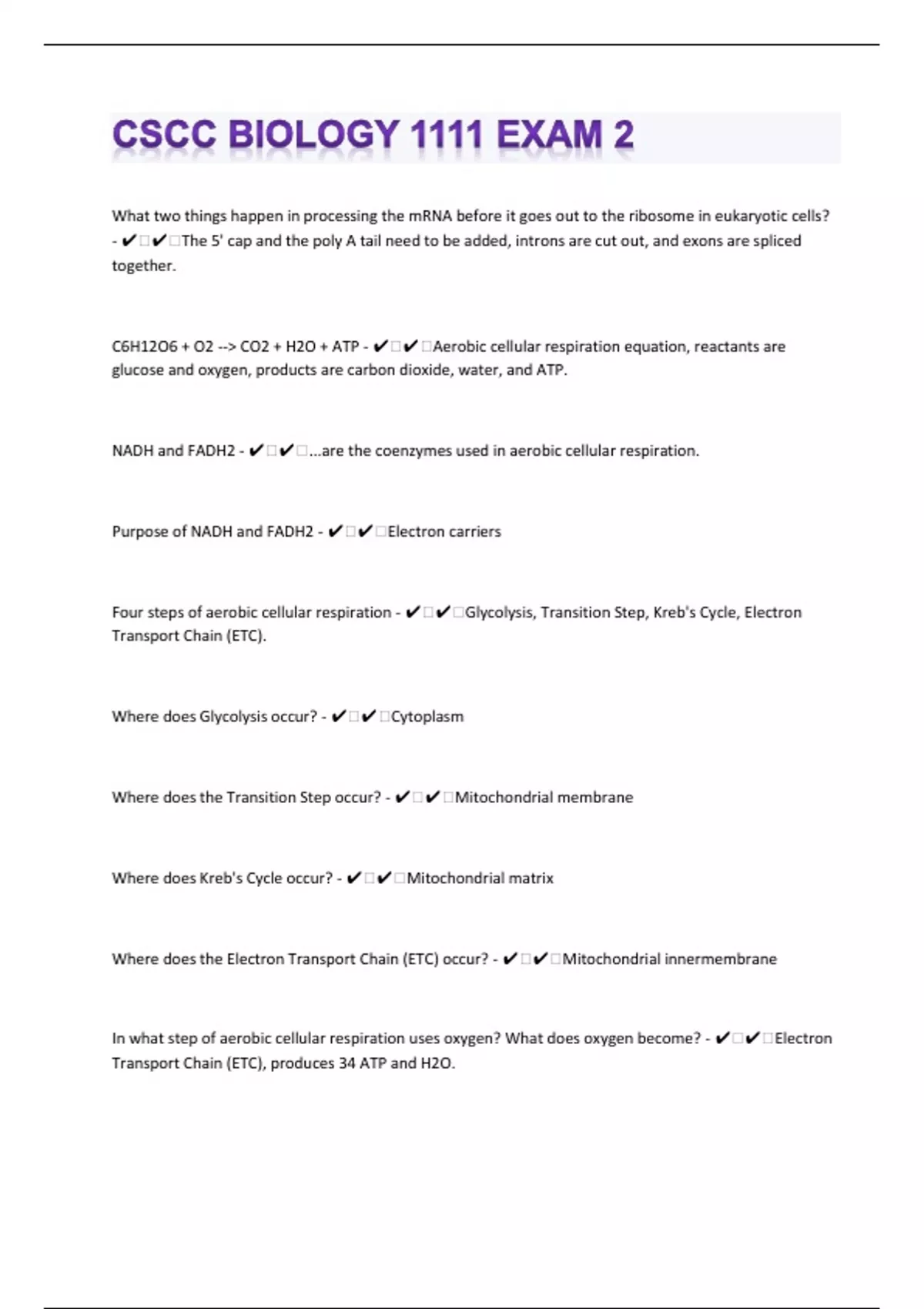What two things happen in processing the mRNA before it goes out to the ribosome in eukaryotic cells? - ️️The 5' cap and the poly A tail need to be added, introns are cut out, and exons are spliced together. C6H12O6 + O2 --> CO2 + H2O + ATP - ️️Aerobic cellular respiration equation, reactants are glucose and oxygen, products are carbon dioxide, water, and ATP. NADH and FADH2 - ️️...are the coenzymes used in aerobic cellular respiration. Purpose of NADH and FADH2 - ️️Electron carriers Four steps of aerobic cellular respiration - ️️Glycolysis, Transition Step, Kreb's Cycle, Electron Transport Chain (ETC). Where does Glycolysis occur? - ️️Cytoplasm Where does the Transition Step occur? - ️️Mitochondrial membrane Where does Kreb's Cycle occur? - ️️Mitochondrial matrix Where does the Electron Transport Chain (ETC) occur? - ️️Mitochondrial innermembrane In what step of aerobic cellular respiration uses oxygen? What does oxygen become? - ️️Electron Transport Chain (ETC), produces 34 ATP and H2O.