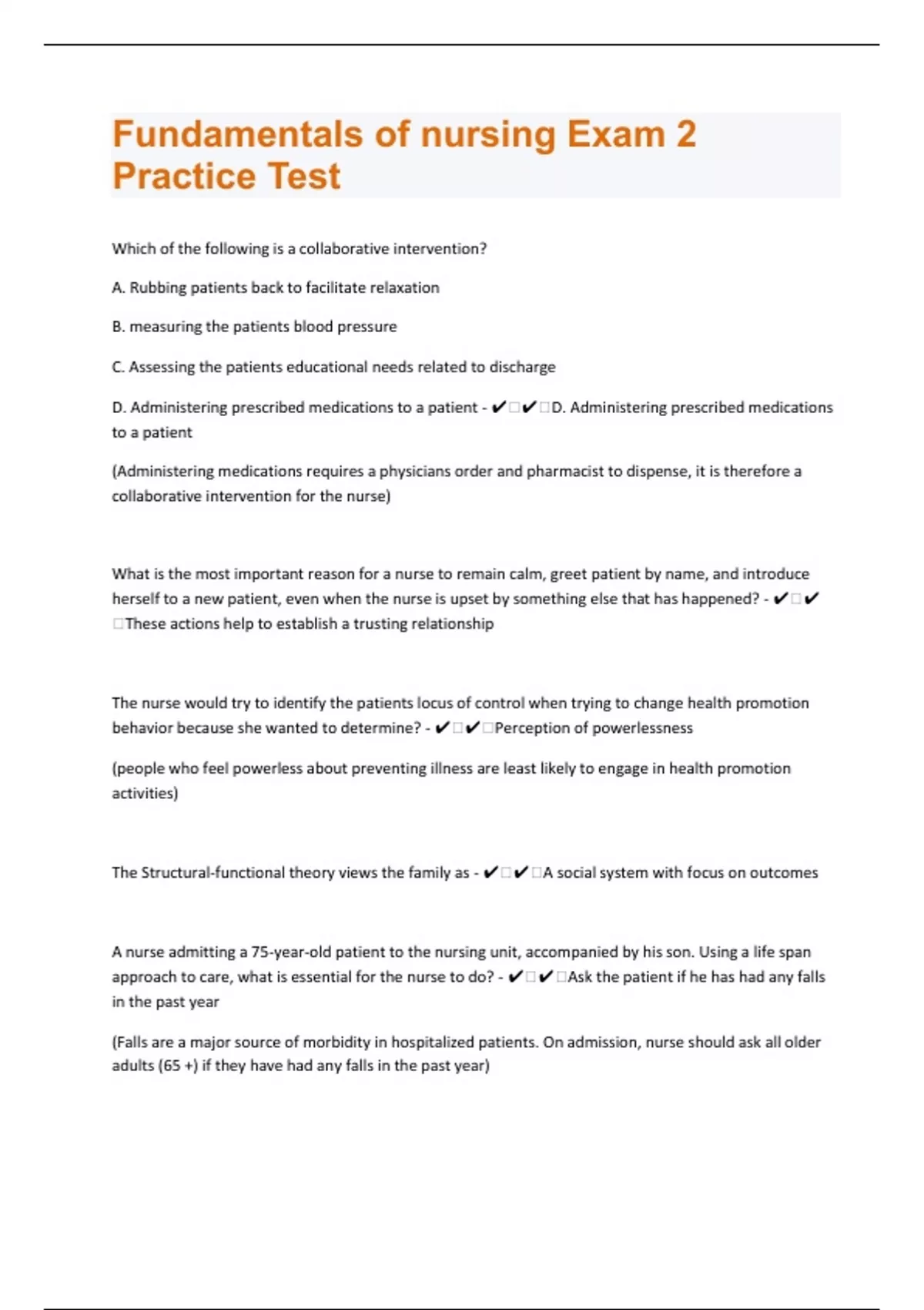 Which of the following is a collaborative intervention? A. Rubbing patients back to facilitate relaxation B. measuring the patients blood pressure C. Assessing the patients educational needs related to discharge D. Administering prescribed medications to a patient - ️️D. Administering prescribed medications to a patient (Administering medications requires a physicians order and pharmacist to dispense, it is therefore a collaborative intervention for the nurse) What is the most important reason for a nurse to remain calm, greet patient by name, and introduce herself to a new patient, even when the nurse is upset by something else that has happened? - ️️These actions help to establish a trusting relationship The nurse would try to identify the patients locus of control when trying to change health promotion behavior because she wanted to determine? - ️️Perception of powerlessness (people who feel powerless about preventing illness are least likely to engage in health promotion activities) The Structural-functional theory views the family as - ️️A social system with focus on outcomes A nurse admitting a 75-year-old patient to the nursing unit, accompanied by his son. Using a life span approach to care, what is essential for the nurse to do? - ️️Ask the patient if he has had any falls in the past year (Falls are a major source of morbidity in hospitalized patients. On admission, nurse should ask all older adults (65 +) if they have had any falls in the past year)
