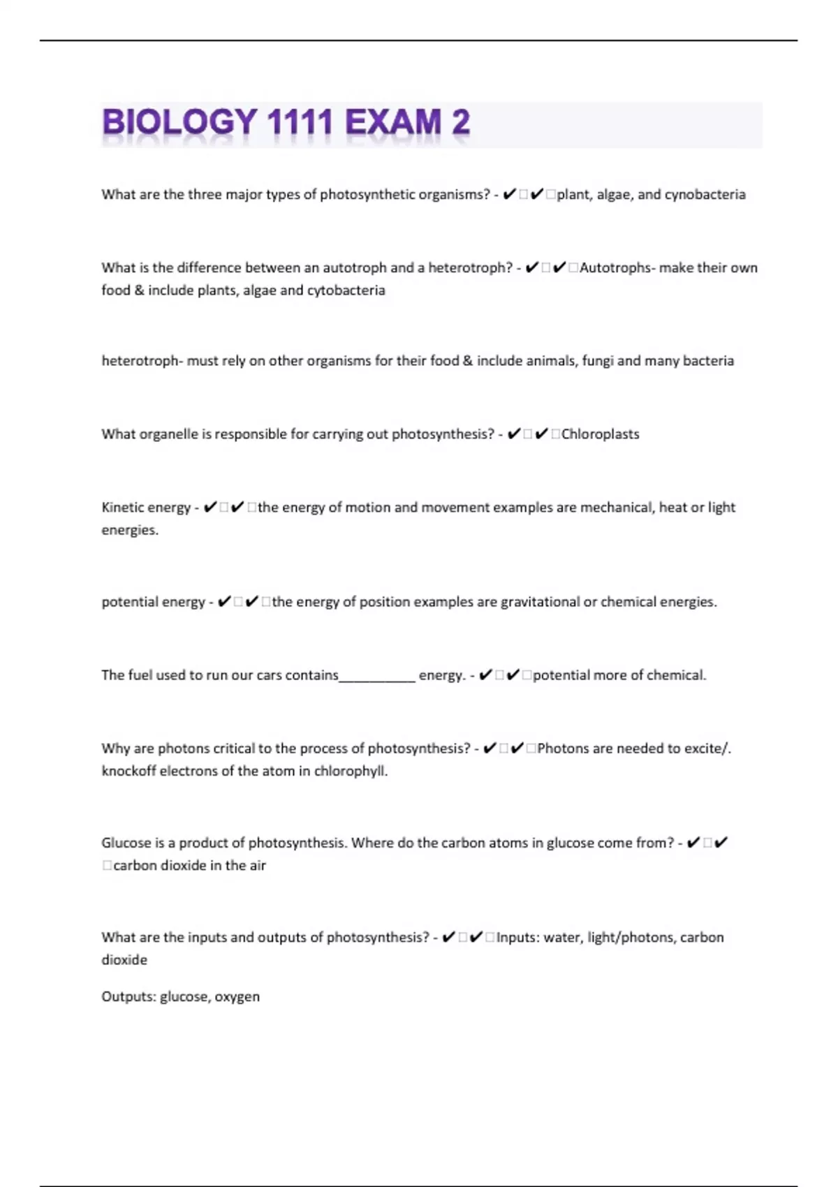 What are the three major types of photosynthetic organisms? - ️️plant, algae, and cynobacteria What is the difference between an autotroph and a heterotroph? - ️️Autotrophs- make their own food & include plants, algae and cytobacteria heterotroph- must rely on other organisms for their food & include animals, fungi and many bacteria What organelle is responsible for carrying out photosynthesis? - ️️Chloroplasts Kinetic energy - ️️the energy of motion and movement examples are mechanical, heat or light energies. potential energy - ️️the energy of position examples are gravitational or chemical energies. The fuel used to run our cars contains__________ energy. - ️️potential more of chemical. Why are photons critical to the process of photosynthesis? - ️️Photons are needed to excite/. knockoff electrons of the atom in chlorophyll. Glucose is a product of photosynthesis. Where do the carbon atoms in glucose come from? - ️️carbon dioxide in the air What are the inputs and outputs of photosynthesis? - ️️Inputs: water, light/photons, carbon dioxide Outputs: glucose, oxygen