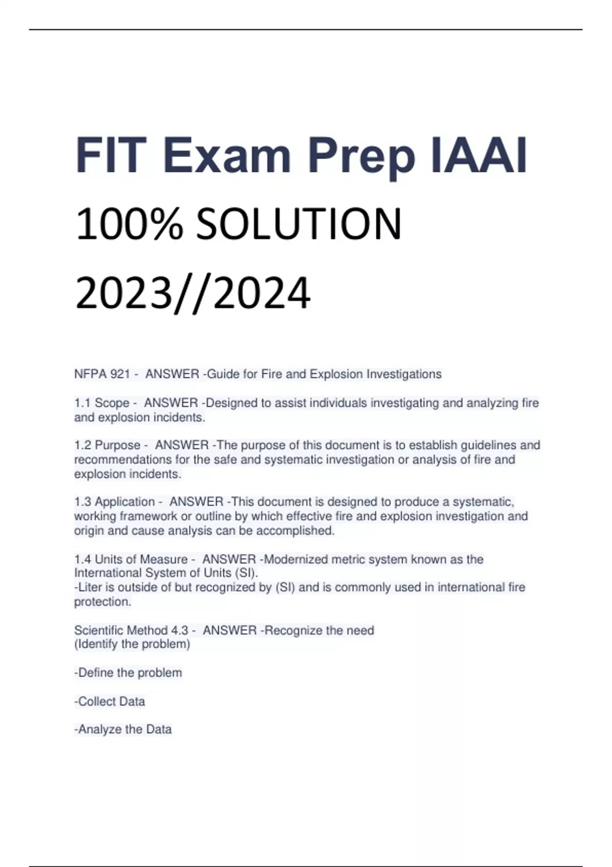 NFPA 921 - ANSWER -Guide for Fire and Explosion Investigations 1.1 Scope - ANSWER -Designed to assist individuals investigating and analyzing fire and explosion incidents. 1.2 Purpose - ANSWER -The purpose of this document is to establish guidelines and recommendations for the safe and systematic investigation or analysis of fire and explosion incidents. 1.3 Application - ANSWER -This document is designed to produce a systematic, working framework or outline by which effective fire and explosion investigation and origin and cause analysis can be accomplished. 1.4 Units of Measure - ANSWER -Modernized metric system known as the International System of Units (SI). -Liter is outside of but recognized by (SI) and is commonly used in international fire protection. Scientific Method 4.3 - ANSWER -Recognize the need (Identify the problem) -Define the problem -Collect Data -Analyze the Data