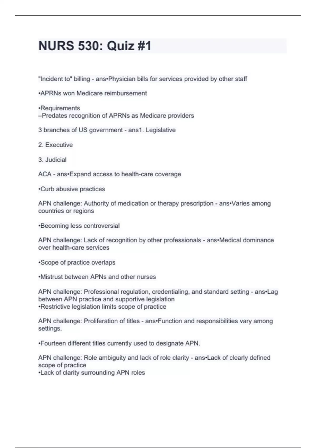 "Incident to" billing - ans•Physician bills for services provided by other staff •APRNs won Medicare reimbursement •Requirements ‒Predates recognition of APRNs as Medicare providers 3 branches of US government - ans1. Legislative