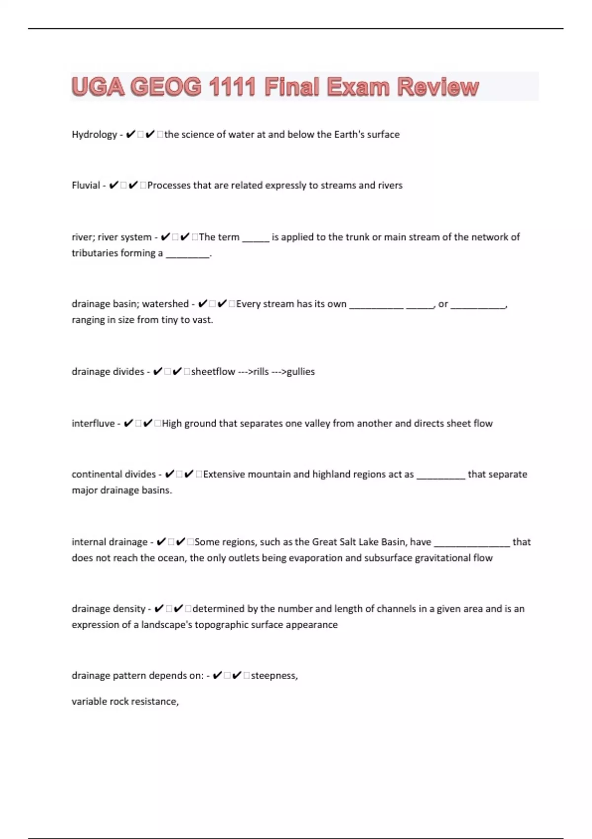 Hydrology - ️️the science of water at and below the Earth's surface Fluvial - ️️Processes that are related expressly to streams and rivers river; river system - ️️The term _____ is applied to the trunk or main stream of the network of tributaries forming a ________. drainage basin; watershed - ️️Every stream has its own __________ _____, or __________, ranging in size from tiny to vast. drainage divides - ️️sheetflow --->rills --->gullies interfluve - ️️High ground that separates one valley from another and directs sheet flow continental divides - ️️Extensive mountain and highland regions act as _________ that separate major drainage basins. internal drainage - ️️Some regions, such as the Great Salt Lake Basin, have ______________ that does not reach the ocean, the only outlets being evaporation and subsurface gravitational flow drainage density - ️️determined by the number and length of channels in a given area and is an expression of a landscape's topographic surface appearance