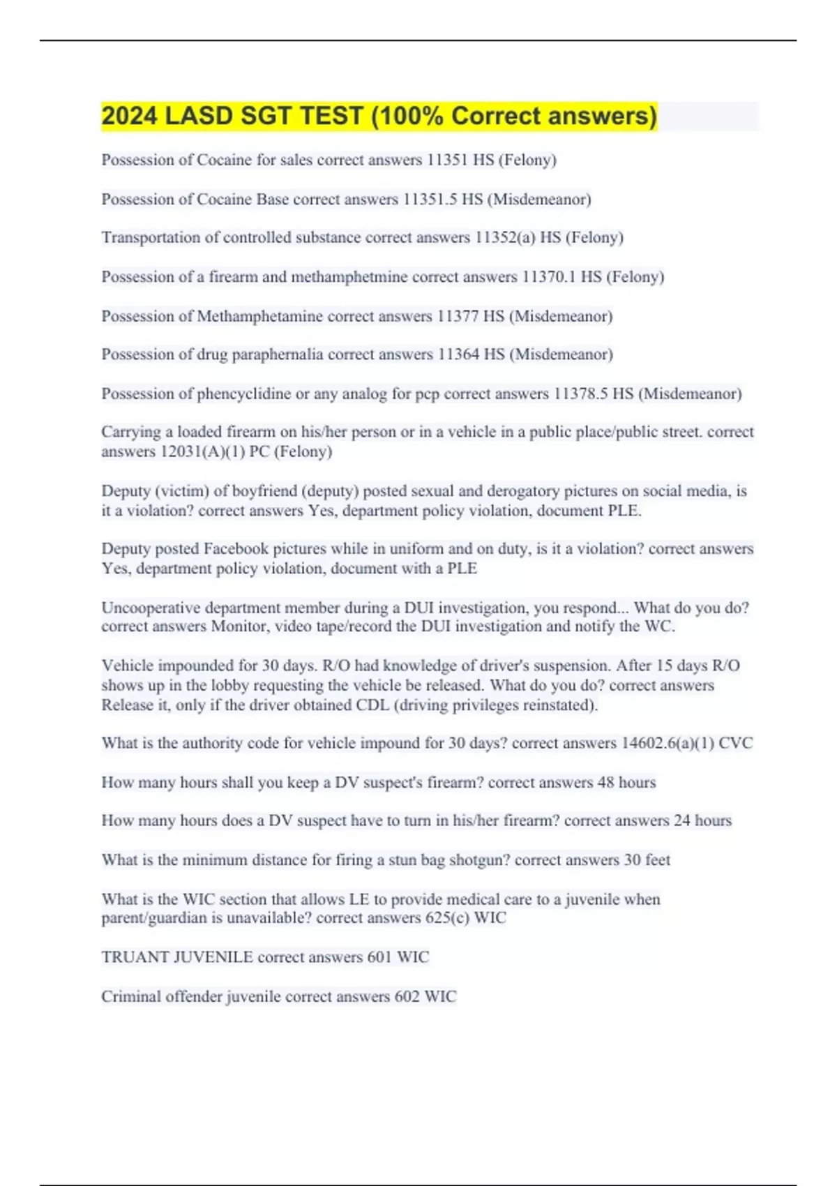 Possession of Cocaine for sales correct answers 11351 HS (Felony) Possession of Cocaine Base correct answers 11351.5 HS (Misdemeanor) Transportation of controlled substance correct answers 11352(a) HS (Felony) Possession of a firearm and methamphetmine correct answers 11370.1 HS (Felony) Possession of Methamphetamine correct answers 11377 HS (Misdemeanor) Possession of drug paraphernalia correct answers 11364 HS (Misdemeanor) Possession of phencyclidine or any analog for pcp correct answers 11378.5 HS (Misdemeanor) Carrying a loaded firearm on his/her person or in a vehicle in a public place/public street. correct answers 12031(A)(1) PC (Felony) Deputy (victim) of boyfriend (deputy) posted sexual and derogatory pictures on social media, is it a violation? correct answers Yes, department policy violation, document PLE. Deputy posted Facebook pictures while in uniform and on duty, is it a violation? correct answers Yes, department policy violation, document with a PLE Uncooperative department member during a DUI investigation, you respond... What do you do? correct answers Monitor, video tape/record the DUI investigation and notify the WC. Vehicle impounded for 30 days. R/O had knowledge of driver's suspension. After 15 days R/O shows up in the lobby requesting the vehicle be released. What do you do? correct answers Release it, only if the driver obtained CDL (driving privileges reinstated). What is the authority code for vehicle impound for 30 days? correct answers 14602.6(a)(1) CVC How many hours shall you keep a DV suspect's firearm? correct answers 48 hours How many hours does a DV suspect have to turn in his/her firearm? correct answers 24 hours What is the minimum distance for firing a stun bag shotgun? correct answers 30 feet What is the WIC section that allows LE to provide medical care to a juvenile when parent/guardian is unavailable? correct answers 625(c) WIC TRUANT JUVENILE correct answers 601 WIC Criminal offender juvenile correct answers 602 WIC