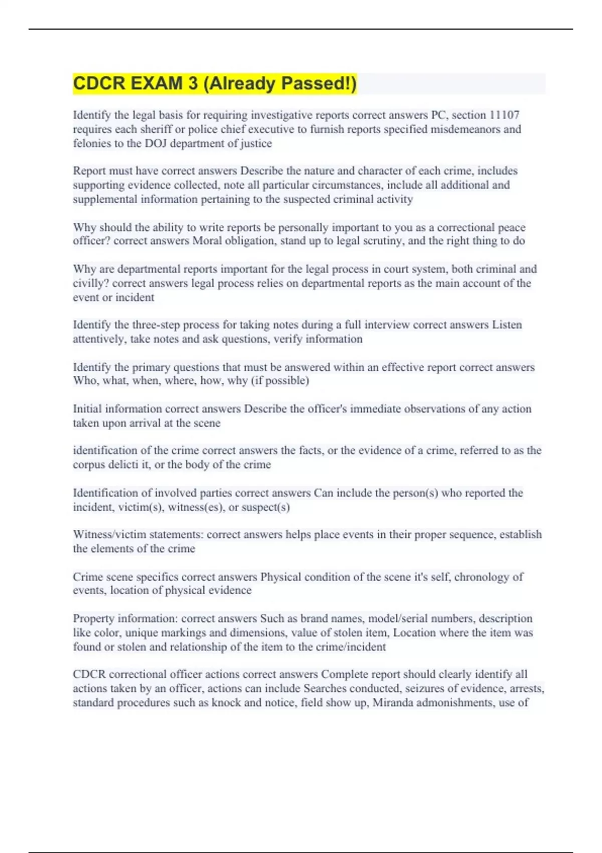 Identify the legal basis for requiring investigative reports correct answers PC, section 11107 requires each sheriff or police chief executive to furnish reports specified misdemeanors and felonies to the DOJ department of justice Report must have correct answers Describe the nature and character of each crime, includes supporting evidence collected, note all particular circumstances, include all additional and supplemental information pertaining to the suspected criminal activity Why should the ability to write reports be personally important to you as a correctional peace officer? correct answers Moral obligation, stand up to legal scrutiny, and the right thing to do Why are departmental reports important for the legal process in court system, both criminal and civilly? correct answers legal process relies on departmental reports as the main account of the event or incident Identify the three-step process for taking notes during a full interview correct answers Listen attentively, take notes and ask questions, verify information Identify the primary questions that must be answered within an effective report correct answers Who, what, when, where, how, why (if possible) Initial information correct answers Describe the officer's immediate observations of any action taken upon arrival at the scene identification of the crime correct answers the facts, or the evidence of a crime, referred to as the corpus delicti it, or the body of the crime Identification of involved parties correct answers Can include the person(s) who reported the incident, victim(s), witness(es), or suspect(s) Witness/victim statements: correct answers helps place events in their proper sequence, establish the elements of the crime Crime scene specifics correct answers Physical condition of the scene it's self, chronology of events, location of physical evidence Property information: correct answers Such as brand names, model/serial numbers, description like color, unique markings and dimensions, value of stolen item, Location where the item was found or stolen and relationship of the item to the crime/incident CDCR correctional officer actions correct answers Complete report should clearly identify all actions taken by an officer, actions can include Searches conducted, seizures of evidence, arrests, standard procedures such as knock and notice, field show up, Miranda admonishments, use of