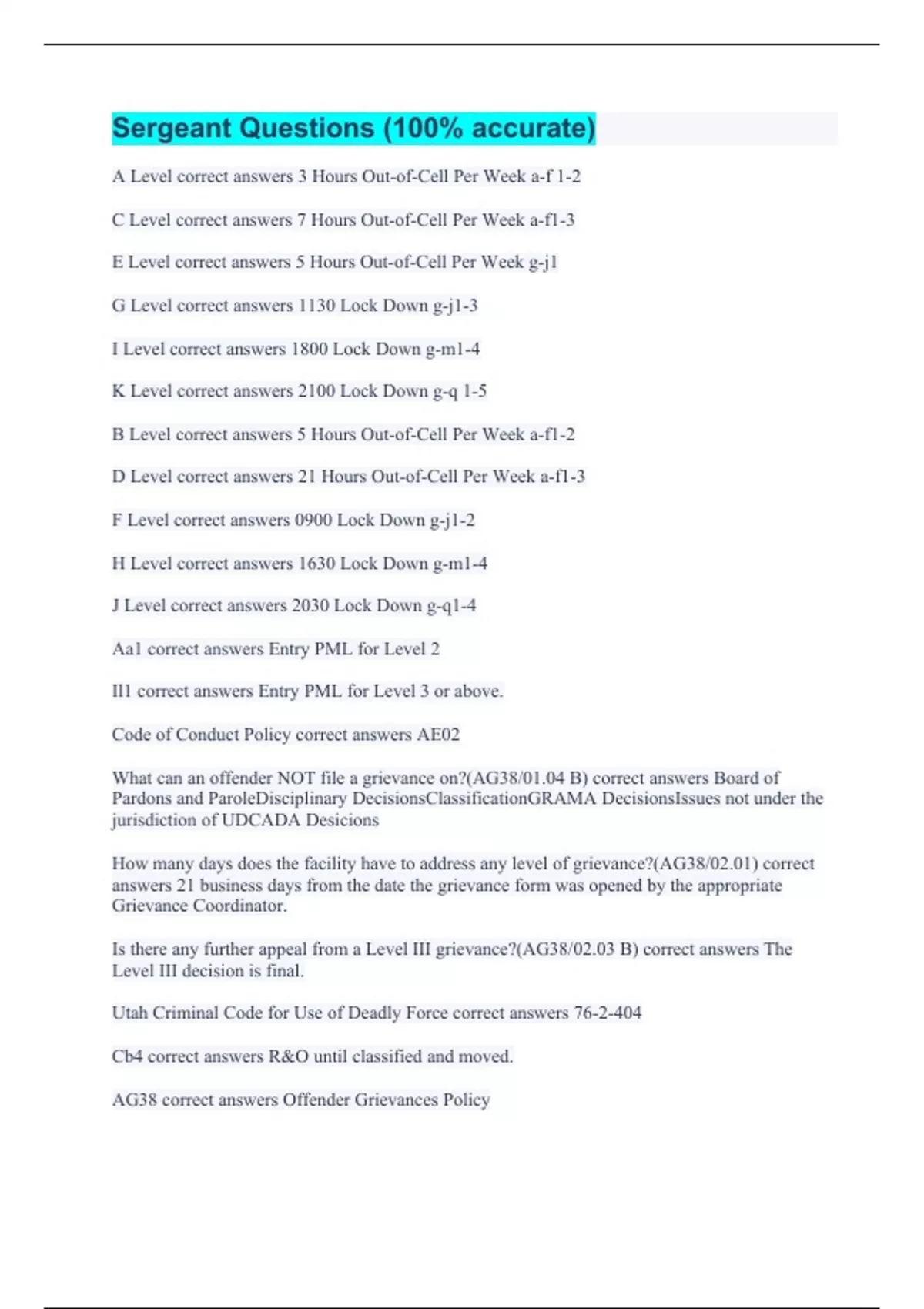 A Level correct answers 3 Hours Out-of-Cell Per Week a-f 1-2 C Level correct answers 7 Hours Out-of-Cell Per Week a-f1-3 E Level correct answers 5 Hours Out-of-Cell Per Week g-j1 G Level correct answers 1130 Lock Down g-j1-3 I Level correct answers 1800 Lock Down g-m1-4 K Level correct answers 2100 Lock Down g-q 1-5 B Level correct answers 5 Hours Out-of-Cell Per Week a-f1-2 D Level correct answers 21 Hours Out-of-Cell Per Week a-f1-3 F Level correct answers 0900 Lock Down g-j1-2 H Level correct answers 1630 Lock Down g-m1-4 J Level correct answers 2030 Lock Down g-q1-4 Aa1 correct answers Entry PML for Level 2 Il1 correct answers Entry PML for Level 3 or above. Code of Conduct Policy correct answers AE02 What can an offender NOT file a grievance on?(AG38/01.04 B) correct answers Board of Pardons and ParoleDisciplinary DecisionsClassificationGRAMA DecisionsIssues not under the jurisdiction of UDCADA Desicions How many days does the facility have to address any level of grievance?(AG38/02.01) correct answers 21 business days from the date the grievance form was opened by the appropriate Grievance Coordinator. Is there any further appeal from a Level III grievance?(AG38/02.03 B) correct answers The Level III decision is final. Utah Criminal Code for Use of Deadly Force correct answers 76-2-404 Cb4 correct answers R&O until classified and moved. AG38 correct answers Offender Grievances Policy