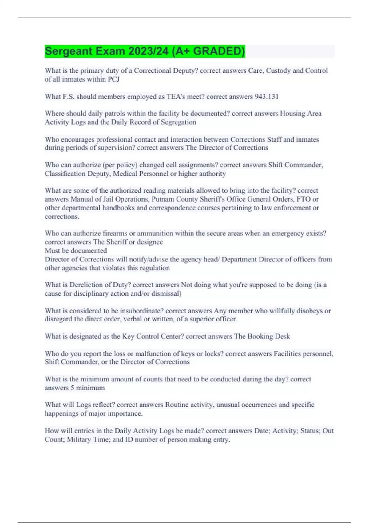 What is the primary duty of a Correctional Deputy? correct answers Care, Custody and Control of all inmates within PCJ What F.S. should members employed as TEA's meet? correct answers 943.131 Where should daily patrols within the facility be documented? correct answers Housing Area Activity Logs and the Daily Record of Segregation Who encourages professional contact and interaction between Corrections Staff and inmates during periods of supervision? correct answers The Director of Corrections Who can authorize (per policy) changed cell assignments? correct answers Shift Commander, Classification Deputy, Medical Personnel or higher authority What are some of the authorized reading materials allowed to bring into the facility? correct answers Manual of Jail Operations, Putnam County Sheriff's Office General Orders, FTO or other departmental handbooks and correspondence courses pertaining to law enforcement or corrections. Who can authorize firearms or ammunition within the secure areas when an emergency exists? correct answers The Sheriff or designee Must be documented Director of Corrections will notify/advise the agency head/ Department Director of officers from other agencies that violates this regulation What is Dereliction of Duty? correct answers Not doing what you're supposed to be doing (is a cause for disciplinary action and/or dismissal) What is considered to be insubordinate? correct answers Any member who willfully disobeys or disregard the direct order, verbal or written, of a superior officer. What is designated as the Key Control Center? correct answers The Booking Desk Who do you report the loss or malfunction of keys or locks? correct answers Facilities personnel, Shift Commander, or the Director of Corrections What is the minimum amount of counts that need to be conducted during the day? correct answers 5 minimum What will Logs reflect? correct answers Routine activity, unusual occurrences and specific happenings of major importance. How will entries in the Daily Activity Logs be made? correct answers Date; Activity; Status; Out Count; Military Time; and ID number of person making entry.