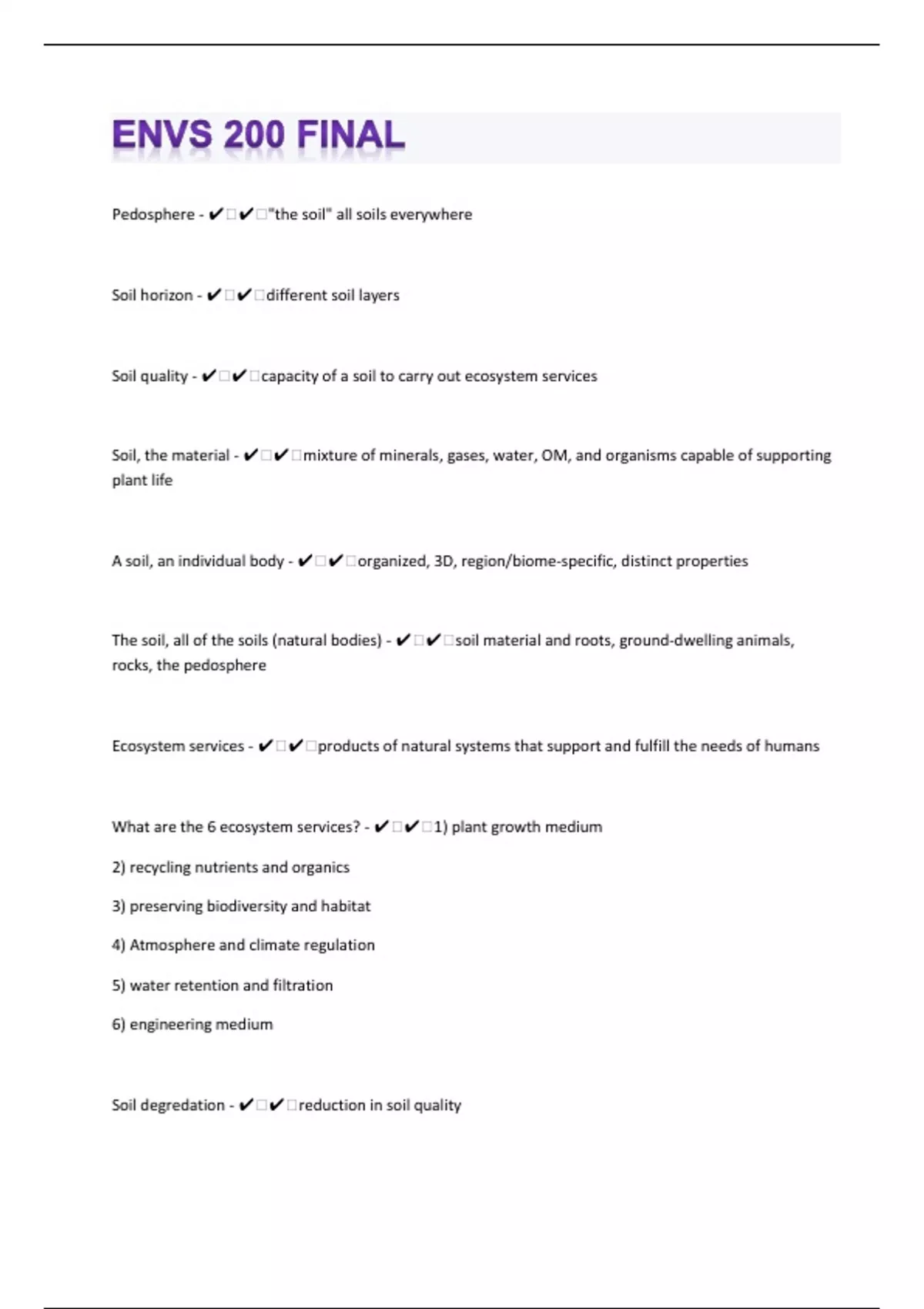 Pedosphere - ️️"the soil" all soils everywhere Soil horizon - ️️different soil layers Soil quality - ️️capacity of a soil to carry out ecosystem services Soil, the material - ️️mixture of minerals, gases, water, OM, and organisms capable of supporting plant life A soil, an individual body - ️️organized, 3D, region/biome-specific, distinct properties The soil, all of the soils (natural bodies) - ️️soil material and roots, ground-dwelling animals, rocks, the pedosphere Ecosystem services - ️️products of natural systems that support and fulfill the needs of humans What are the 6 ecosystem services? - ️️1) plant growth medium 2) recycling nutrients and organics 3) preserving biodiversity and habitat 4) Atmosphere and climate regulation 5) water retention and filtration 6) engineering medium Soil degredation - ️️reduction in soil quality