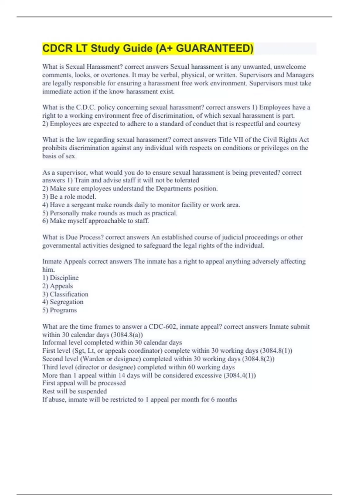 What is Sexual Harassment? correct answers Sexual harassment is any unwanted, unwelcome comments, looks, or overtones. It may be verbal, physical, or written. Supervisors and Managers are legally responsible for ensuring a harassment free work environment. Supervisors must take immediate action if the know harassment exist. What is the C.D.C. policy concerning sexual harassment? correct answers 1) Employees have a right to a working environment free of discrimination, of which sexual harassment is part. 2) Employees are expected to adhere to a standard of conduct that is respectful and courtesy What is the law regarding sexual harassment? correct answers Title VII of the Civil Rights Act prohibits discrimination against any individual with respects on conditions or privileges on the basis of sex. As a supervisor, what would you do to ensure sexual harassment is being prevented? correct answers 1) Train and advise staff it will not be tolerated 2) Make sure employees understand the Departments position. 3) Be a role model. 4) Have a sergeant make rounds daily to monitor facility or work area. 5) Personally make rounds as much as practical. 6) Make myself approachable to staff. What is Due Process? correct answers An established course of judicial proceedings or other governmental activities designed to safeguard the legal rights of the individual. Inmate Appeals correct answers The inmate has a right to appeal anything adversely affecting him. 1) Discipline 2) Appeals 3) Classification 4) Segregation 5) Programs What are the time frames to answer a CDC-602, inmate appeal? correct answers Inmate submit within 30 calendar days (3084.8(a)) Informal level completed within 30 calendar days First level (Sgt, Lt, or appeals coordinator) complete within 30 working days (3084.8(1)) Second level (Warden or designee) completed within 30 working days (3084.8(2)) Third level (director or designee) completed within 60 working days More than 1 appeal within 14 days will be considered excessive (3084.4(1)) First appeal will be processed Rest will be suspended If abuse, inmate will be restricted to 1 appeal per month for 6 months