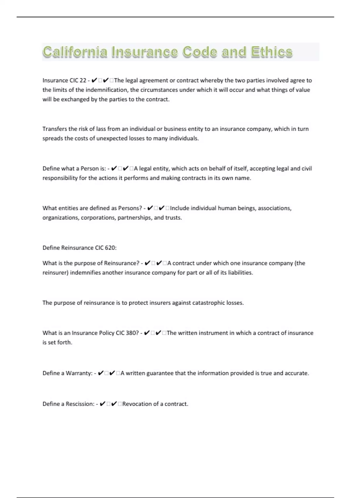Insurance CIC 22 - ️️The legal agreement or contract whereby the two parties involved agree to the limits of the indemnification, the circumstances under which it will occur and what things of value will be exchanged by the parties to the contract. Transfers the risk of lass from an individual or business entity to an insurance company, which in turn spreads the costs of unexpected losses to many individuals. Define what a Person is: - ️️A legal entity, which acts on behalf of itself, accepting legal and civil responsibility for the actions it performs and making contracts in its own name. What entities are defined as Persons? - ️️Include individual human beings, associations, organizations, corporations, partnerships, and trusts. Define Reinsurance CIC 620: What is the purpose of Reinsurance? - ️️A contract under which one insurance company (the reinsurer) indemnifies another insurance company for part or all of its liabilities. The purpose of reinsurance is to protect insurers against catastrophic losses. What is an Insurance Policy CIC 380? - ️️The written instrument in which a contract of insurance is set forth. Define a Warranty: - ️️A written guarantee that the information provided is true and accurate. Define a Rescission: - ️️Revocation of a contract
