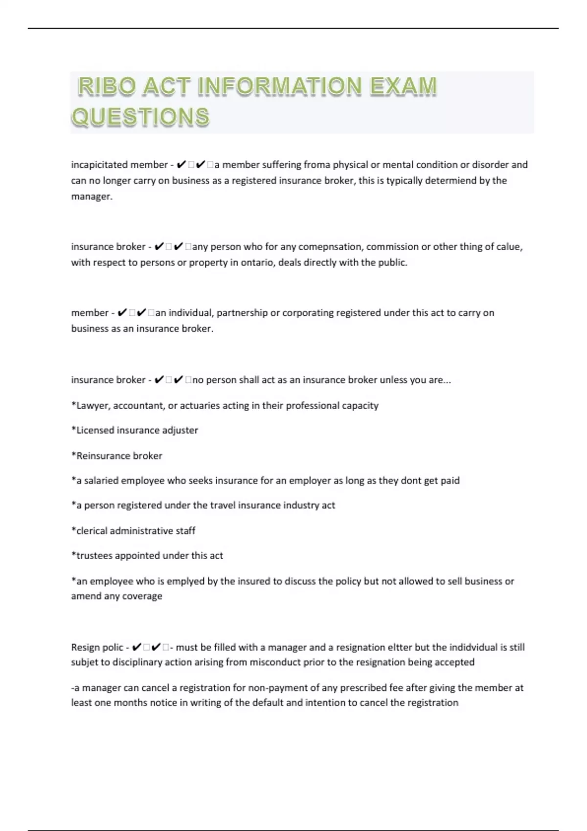 incapicitated member - ️️a member suffering froma physical or mental condition or disorder and can no longer carry on business as a registered insurance broker, this is typically determiend by the manager. insurance broker - ️️any person who for any comepnsation, commission or other thing of calue, with respect to persons or property in ontario, deals directly with the public. member - ️️an individual, partnership or corporating registered under this act to carry on business as an insurance broker. insurance broker - ️️no person shall act as an insurance broker unless you are... *Lawyer, accountant, or actuaries acting in their professional capacity *Licensed insurance adjuster *Reinsurance broker *a salaried employee who seeks insurance for an employer as long as they dont get paid *a person registered under the travel insurance industry act *clerical administrative staff *trustees appointed under this act *an employee who is emplyed by the insured to discuss the policy but not allowed to sell business or amend any coverage Resign polic - ️️- must be filled with a manager and a resignation eltter but the indidvidual is still subjet to disciplinary action arising from misconduct prior to the resignation being accepted -a manager can cancel a registration for non-payment of any prescribed fee after giving the member at least one months notice in writing of the default and intention to cancel the registration