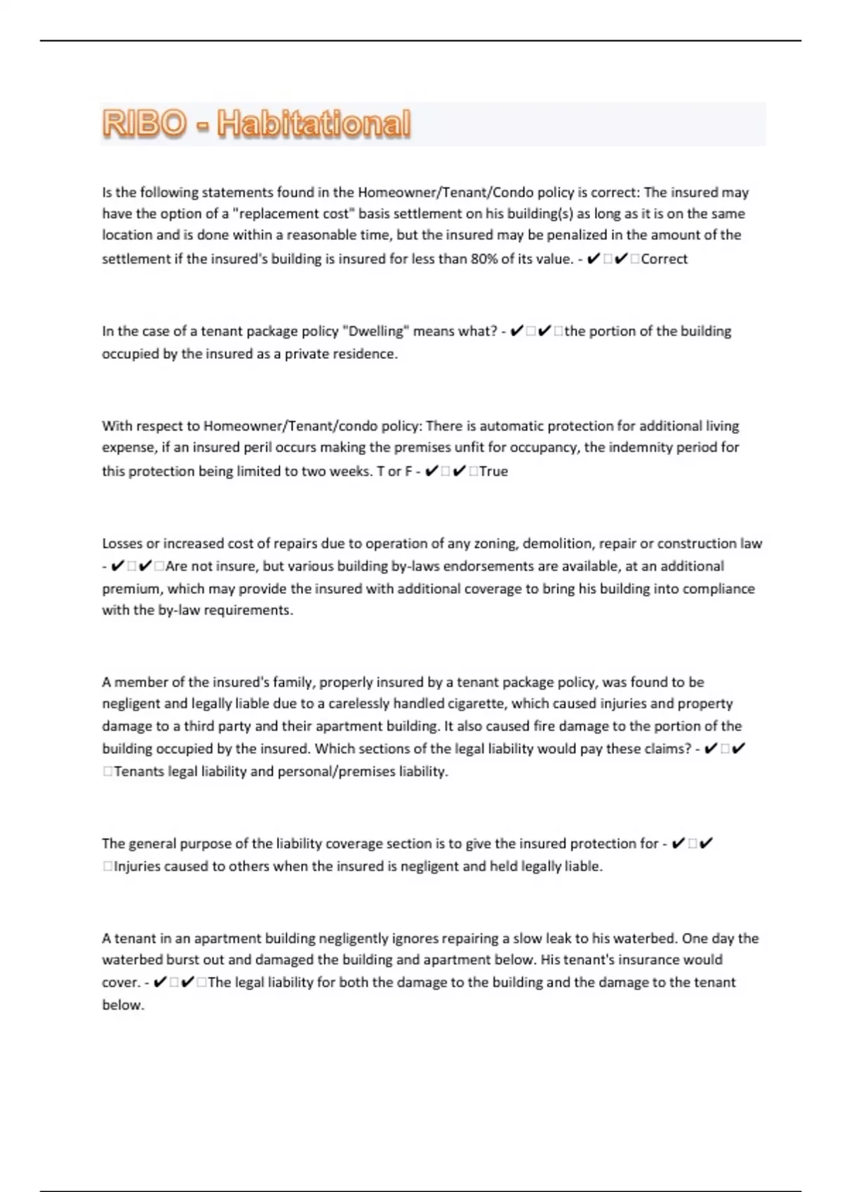 Is the following statements found in the Homeowner/Tenant/Condo policy is correct: The insured may have the option of a "replacement cost" basis settlement on his building(s) as long as it is on the same location and is done within a reasonable time, but the insured may be penalized in the amount of the settlement if the insured's building is insured for less than 80% of its value. - ️️Correct In the case of a tenant package policy "Dwelling" means what? - ️️the portion of the building occupied by the insured as a private residence. With respect to Homeowner/Tenant/condo policy: There is automatic protection for additional living expense, if an insured peril occurs making the premises unfit for occupancy, the indemnity period for this protection being limited to two weeks. T or F - ️️True Losses or increased cost of repairs due to operation of any zoning, demolition, repair or construction law - ️️Are not insure, but various building by-laws endorsements are available, at an additional premium, which may provide the insured with additional coverage to bring his building into compliance with the by-law requirements. A member of the insured's family, properly insured by a tenant package policy, was found to be negligent and legally liable due to a carelessly handled cigarette, which caused injuries and property damage to a third party and their apartment building. It also caused fire damage to the portion of the building occupied by the insured. Which sections of the legal liability would pay these claims? - ️️Tenants legal liability and personal/premises liability. The general purpose of the liability coverage section is to give the insured protection for - ️️Injuries caused to others when the insured is negligent and held legally liable. A tenant in an apartment building negligently ignores repairing a slow leak to his waterbed. One day the waterbed burst out and damaged the building and apartment below. His tenant's insurance would cover. - ️️The legal liability for both the damage to the building and the damage to the tenant below.