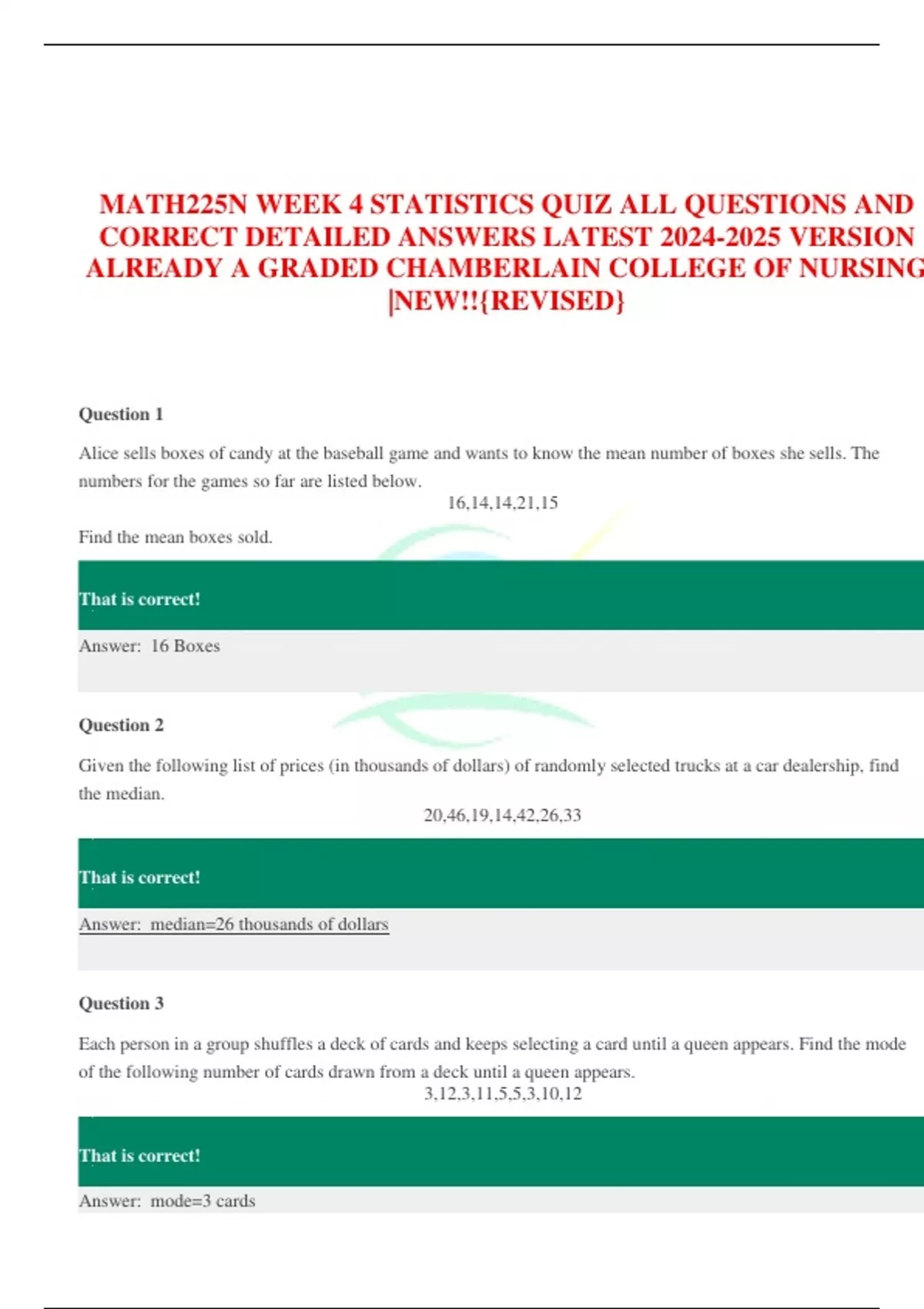 MATH225N WEEK 4 STATISTICS QUIZ ALL QUESTIONS AND CORRECT DETAILED ANSWERS LATEST VERSION ALREADY A GRADED CHAMBERLAIN COLLEGE OF NURSING |NEW!!{REVISED}