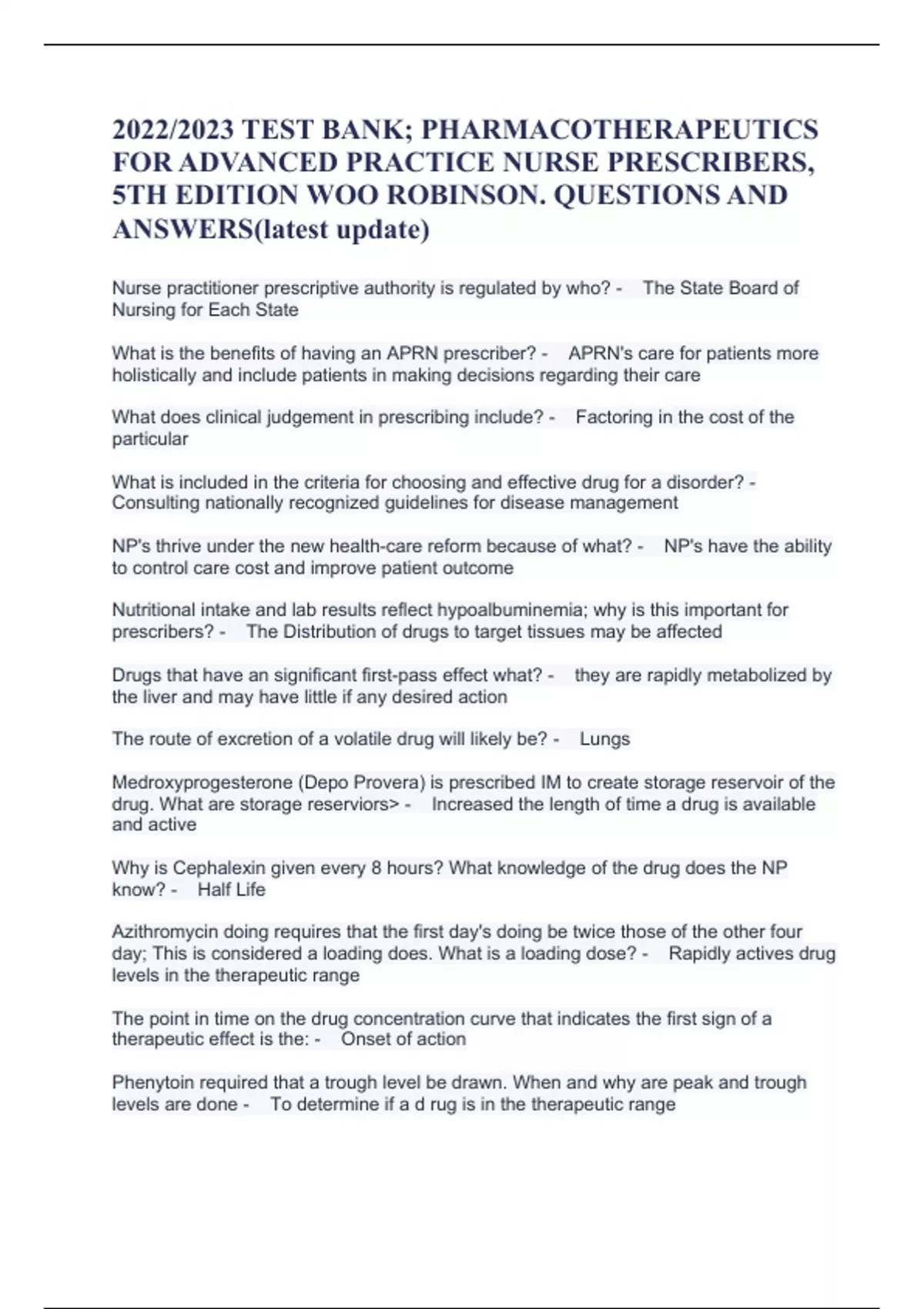2022/2023 TEST BANK; PHARMACOTHERAPEUTICS FOR ADVANCED PRACTICE NURSE PRESCRIBERS, 5TH EDITION WOO ROBINSON. QUESTIONS AND ANSWERS(latest update)