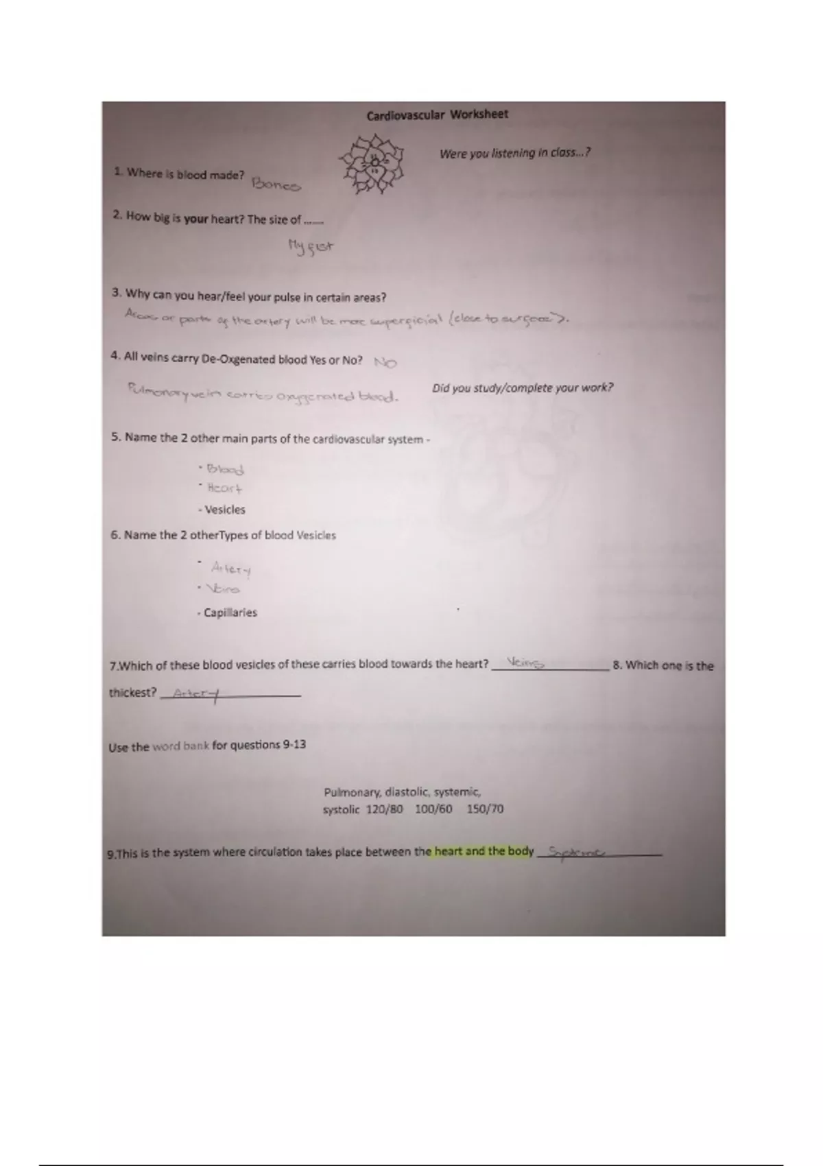 The worksheet tests your understanding and knowledge regarding the Cardiovascular System. It is a simple test that doesn’t require too much stress or effort, just a mini quiz to check if you were listening to class. Break a leg!
