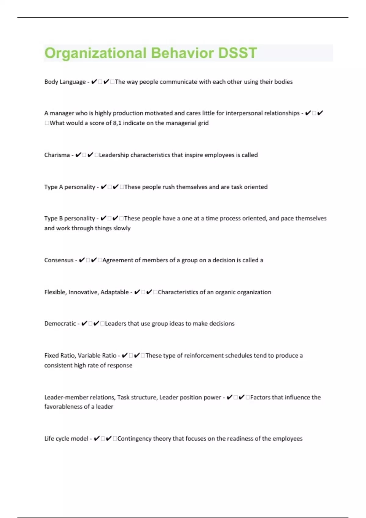 Body Language - ️️The way people communicate with each other using their bodies A manager who is highly production motivated and cares little for interpersonal relationships - ️️What would a score of 8,1 indicate on the managerial grid Charisma - ️️Leadership characteristics that inspire employees is called Type A personality - ️️These people rush themselves and are task oriented Type B personality - ️️These people have a one at a time process oriented, and pace themselves and work through things slowly Consensus - ️️Agreement of members of a group on a decision is called a Flexible, Innovative, Adaptable - ️️Characteristics of an organic organization Democratic - ️️Leaders that use group ideas to make decisions Fixed Ratio, Variable Ratio - ️️These type of reinforcement schedules tend to produce a consistent high rate of response Leader-member relations, Task structure, Leader position power - ️️Factors that influence the favorableness of a leader Life cycle model - ️️Contingency theory that focuses on the readiness of the employees
