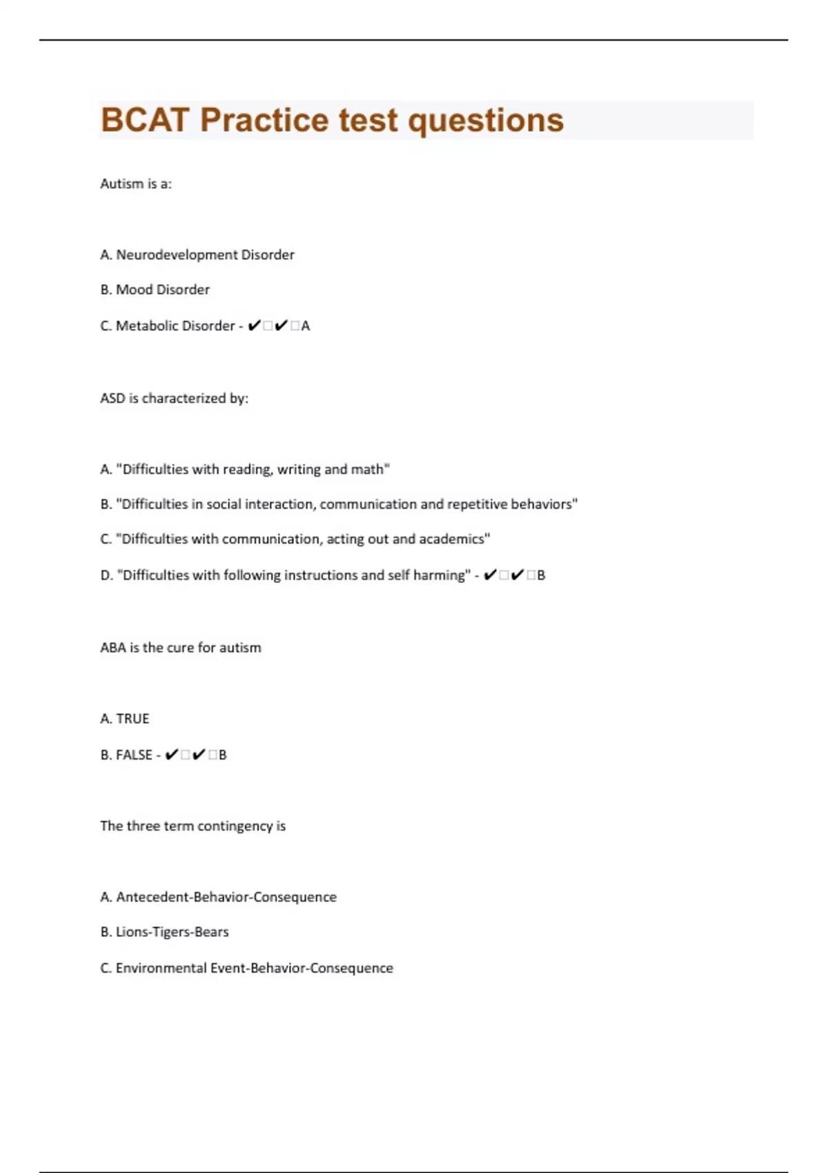 Autism is a: A. Neurodevelopment Disorder B. Mood Disorder C. Metabolic Disorder - ️️A ASD is characterized by: A. "Difficulties with reading, writing and math" B. "Difficulties in social interaction, communication and repetitive behaviors" C. "Difficulties with communication, acting out and academics" D. "Difficulties with following instructions and self harming" - ️️B ABA is the cure for autism A. TRUE B. FALSE - ️️B The three term contingency is A. Antecedent-Behavior-Consequence B. Lions-Tigers-Bears C. Environmental Event-Behavior-Consequence D. Antecedent-Behavior-Reward - ️️A