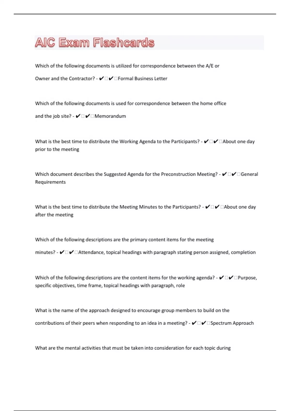 Which of the following documents is utilized for correspondence between the A/E or Owner and the Contractor? - ️️Formal Business Letter Which of the following documents is used for correspondence between the home office and the job site? - ️️Memorandum What is the best time to distribute the Working Agenda to the Participants? - ️️About one day prior to the meeting Which document describes the Suggested Agenda for the Preconstruction Meeting? - ️️General Requirements What is the best time to distribute the Meeting Minutes to the Participants? - ️️About one day after the meeting Which of the following descriptions are the primary content items for the meeting minutes? - ️️Attendance, topical headings with paragraph stating person assigned, completion Which of the following descriptions are the content items for the working agenda? - ️️Purpose, specific objectives, time frame, topical headings with paragraph, role What is the name of the approach designed to encourage group members to build on the contributions of their peers when responding to an idea in a meeting? - ️️Spectrum Approach What are the mental activities that must be taken into consideration for each topic during the planning phase of a meeting? - ️️Goals, Gathering, Problem Solving, Decision Making, Action Plan & Monitoring