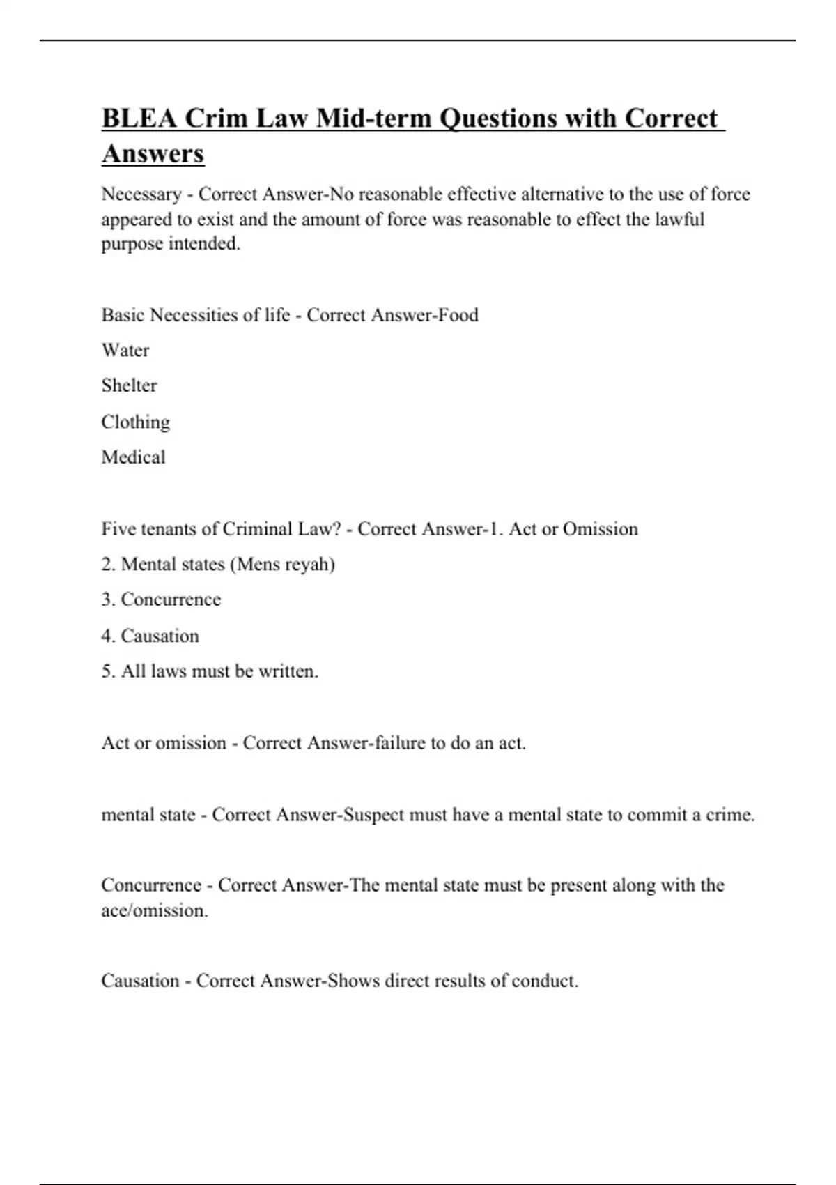 Necessary - Correct Answer-No reasonable effective alternative to the use of force appeared to exist and the amount of force was reasonable to effect the lawful purpose intended. Basic Necessities of life - Correct Answer-Food Water Shelter Clothing Medical Five tenants of Criminal Law? - Correct Answer-1. Act or Omission 2. Mental states (Mens reyah) 3. Concurrence 4. Causation 5. All laws must be written. Act or omission - Correct Answer-failure to do an act. mental state - Correct Answer-Suspect must have a mental state to commit a crime. Concurrence - Correct Answer-The mental state must be present along with the ace/omission. Causation - Correct Answer-Shows