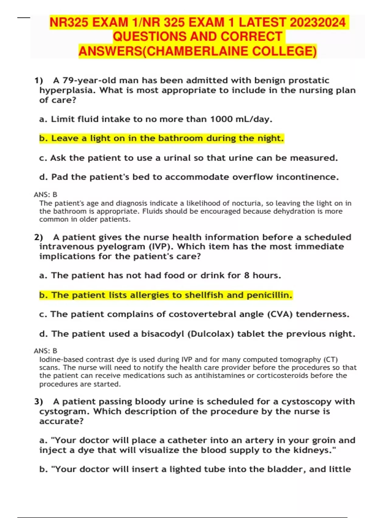 NR325 EXAM 1/NR 325 EXAM 1 LATEST QUESTIONS AND CORRECT ANSWERS(CHAMBERLAINE COLLEGE) 1) A 79-year-old man has been admitted with benign prostatic hyperplasia. What is most appropriate to include in the nursing plan of care? a. Limit fluid intake to no more than 1000 mL/day. b. Leave a light on in the bathroom during the night. c. Ask the patient to use a urinal so that urine can be measured. d. Pad the patient's bed to accommodate overflow incontinence. ANS: B The patient's age and diagnosis indicate a likelihood of nocturia, so leaving the light on in the bathroom is appropriate. Fluids should be encouraged because dehydration is more common in older patients. 2) A patient gives the nurse health information before a scheduled intravenous pyelogram (IVP). Which item has the most immediate implications for the patient's care? a. The patient has not had food or drink for 8 hours. b. The patient lists allergies to shellfish and penicillin. c. The patient complains of costovertebral angle (CVA) tenderness. d. The patient used a bisacodyl (Dulcolax) tablet the previous night. ANS: B Iodine-based contrast dye is used during IVP and for many computed tomography (CT) scans. The nurse will need to notify the health care provider before the procedures so that the patient can receive medications such as antihistamines or corticosteroids before the procedures are started. 3) A patient passing bloody urine is scheduled for a cystoscopy with cystogram. Which description of the procedure by the nurse is accurate? a. "Your doctor will place a catheter into an artery in your groin and inject a dye that will visualize the blood supply to the kidneys." b. "Your doctor will insert a lighted tube into the bladder, and little catheters will be inserted through the tube into your kidney." c. "Your doctor will insert a lighted tube into the bladder through your urethra, inspect the bladder, and instill a dye that will outline your bladder on x-ray." d. "Your doctor will inject a radioactive solution into a vein in your arm and the distribution of the isotope in your kidneys and bladder will be checked." ANS: C In a cystoscope and cystogram procedure, a cystoscope is inserted into the bladder for direct visualization, and then contrast solution is injected through the scope so that x-rays can be taken. 4) Which nursing action is essential for a patient immediately after a renal biopsy? a. Check blood glucose to assess for hyperglycemia or hypoglycemia. b. Insert a urinary catheter and test urine for gross or microscopic hematuria. c. Monitor the blood urea nitrogen (BUN) and creatinine to assess renal function. d. Apply a pressure dressing and keep the patient on the affected side for 30 minutes.