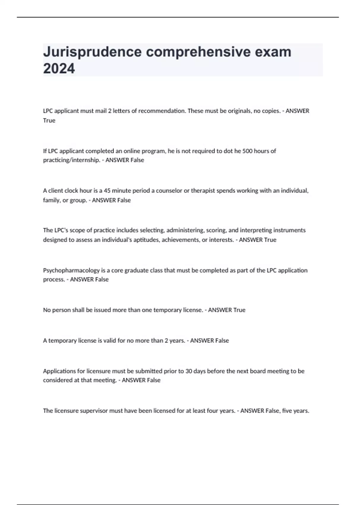 Jurisprudence comprehensive exam 2024 LPC applicant must mail 2 letters of recommendation. These must be originals, no copies. True If LPC applicant completed an online program, he is not required to dot he 500 hours of practicing/internship. False A client clock hour is a 45 minute period a counselor or therapist spends working with an individual, family, or group. False