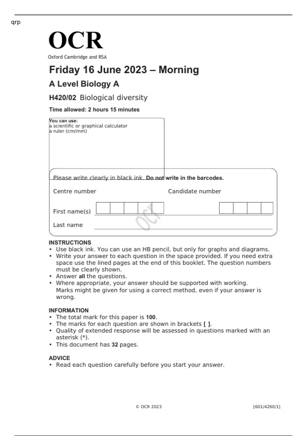 OCR A Level Biology A H420/02 JUNE 2025 QUESTION PAPER: Biological diversity